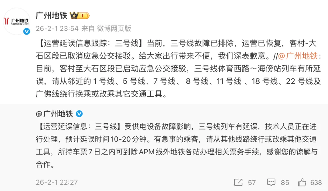 有网友发文描述亲历过程:太可怕了,先是有碰撞声,再有火花,然后全车厢灭灯,到站不开门。帖子定位显示其在三号线大塘站,配图显示列车车厢内灭灯。