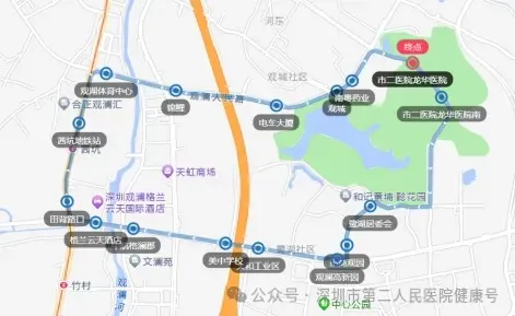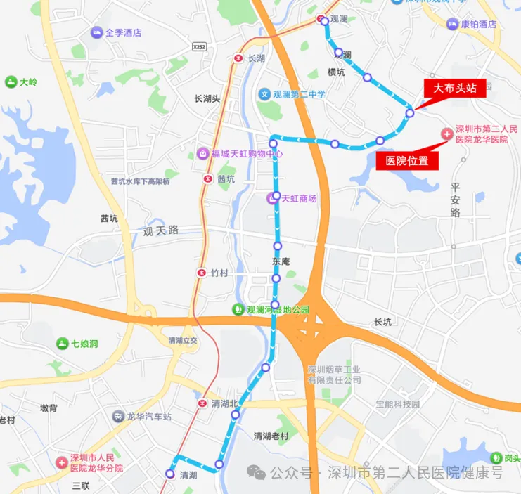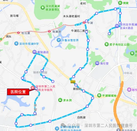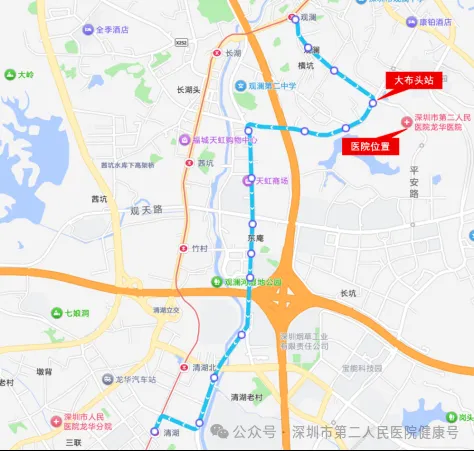 乘坐B862、B921、M287至“深圳市第二人民医院龙华医院”公交站下车,步行100米至门诊部。