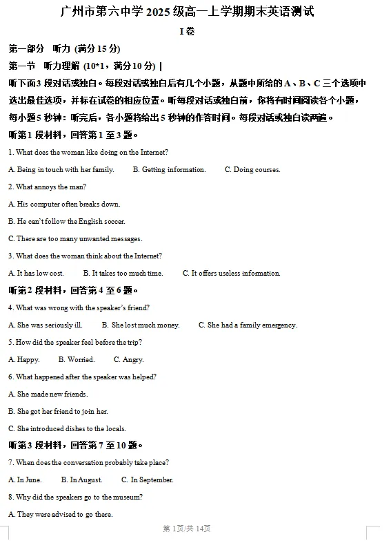 广州高一英语期末卷完整解析!附电子版 + 名师逐题精讲(速领)