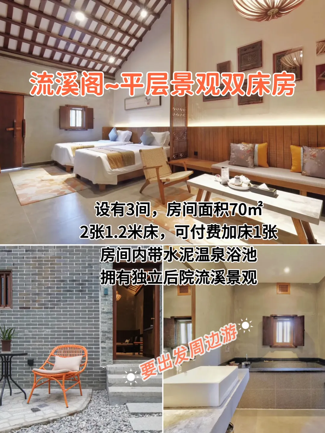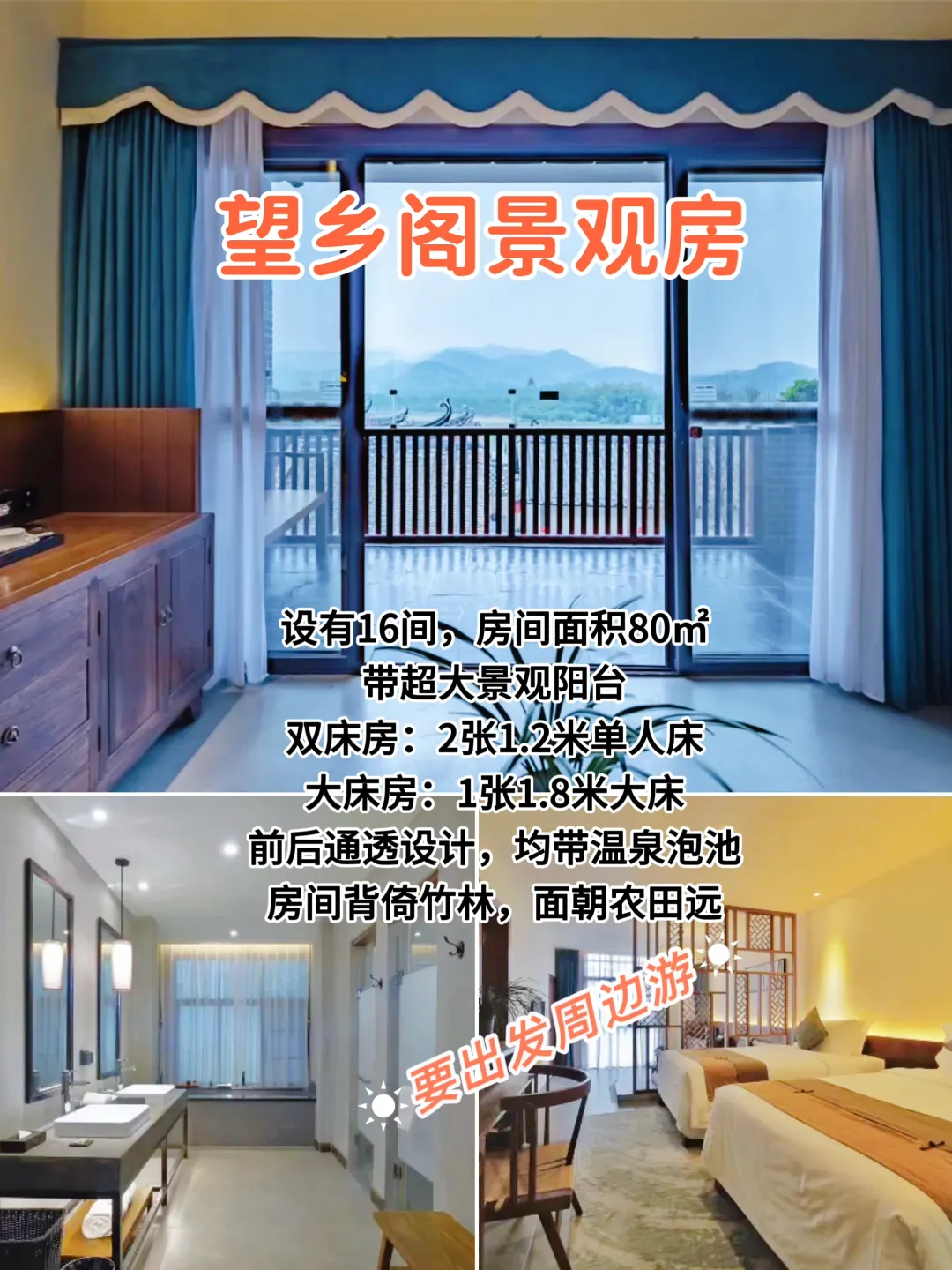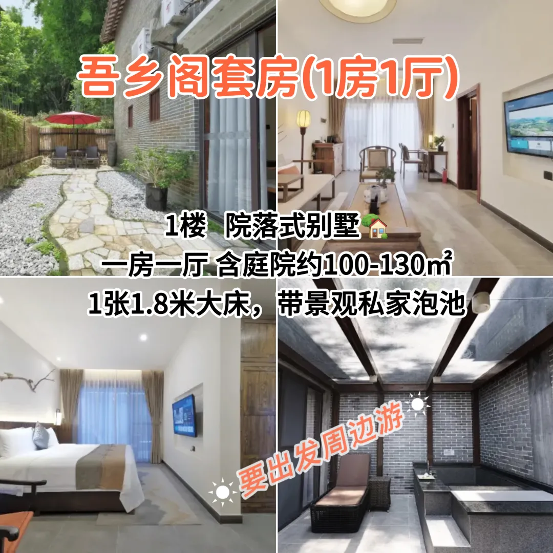 设有16间,房间面积80㎡📍2-3楼,带超大景观阳台双床房:2张1.2米单人床大床房:1张1.8米大床前后通透设计,均带温泉泡池房间背倚竹林,面朝农田远山
