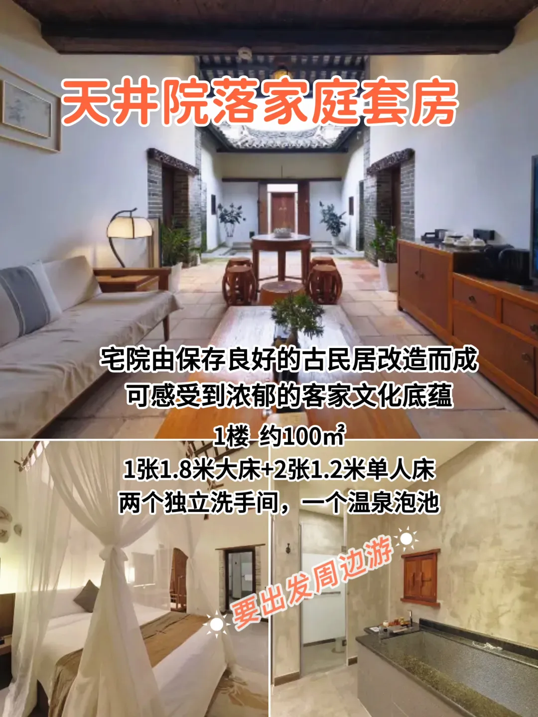 天井院落套房两室一厅📍1楼 约100㎡1张1.8米大床+2张1.2米单人床两个独立洗手间,一个温泉泡池