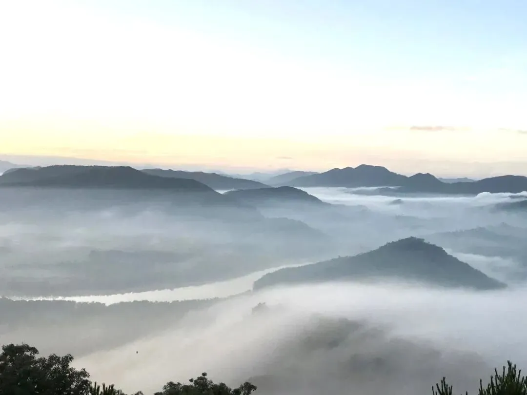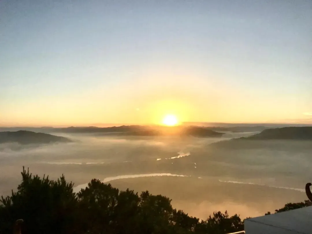 在静谧山水间环抱的石屋炮楼顶昼看日出,