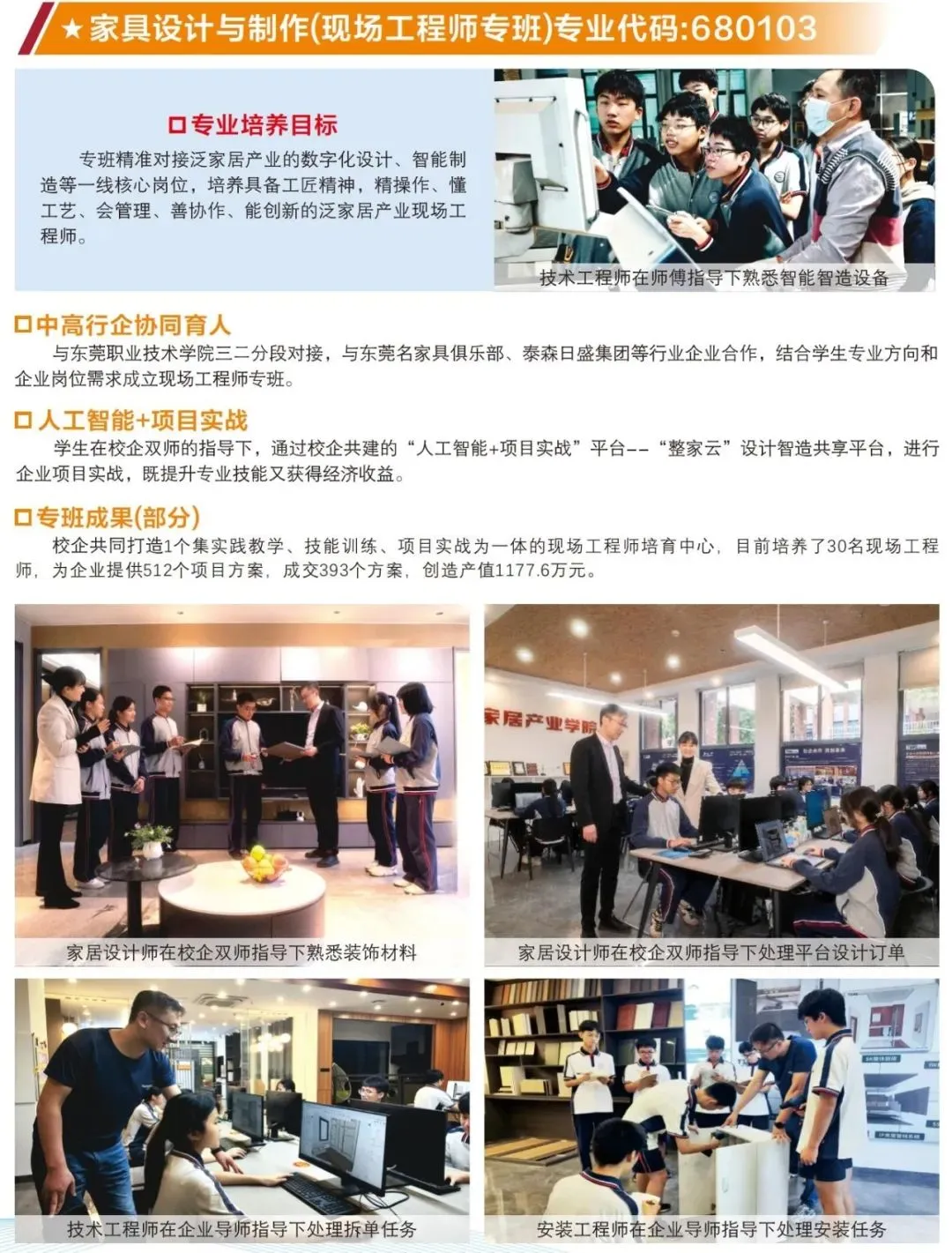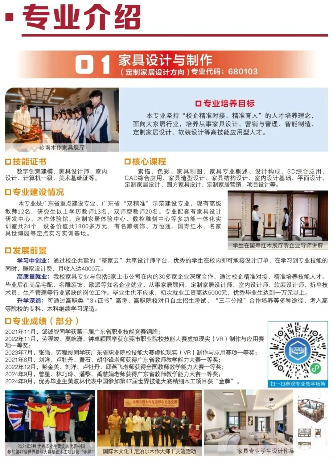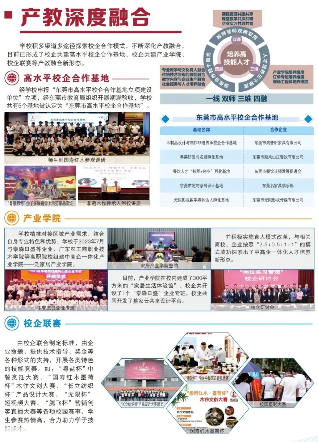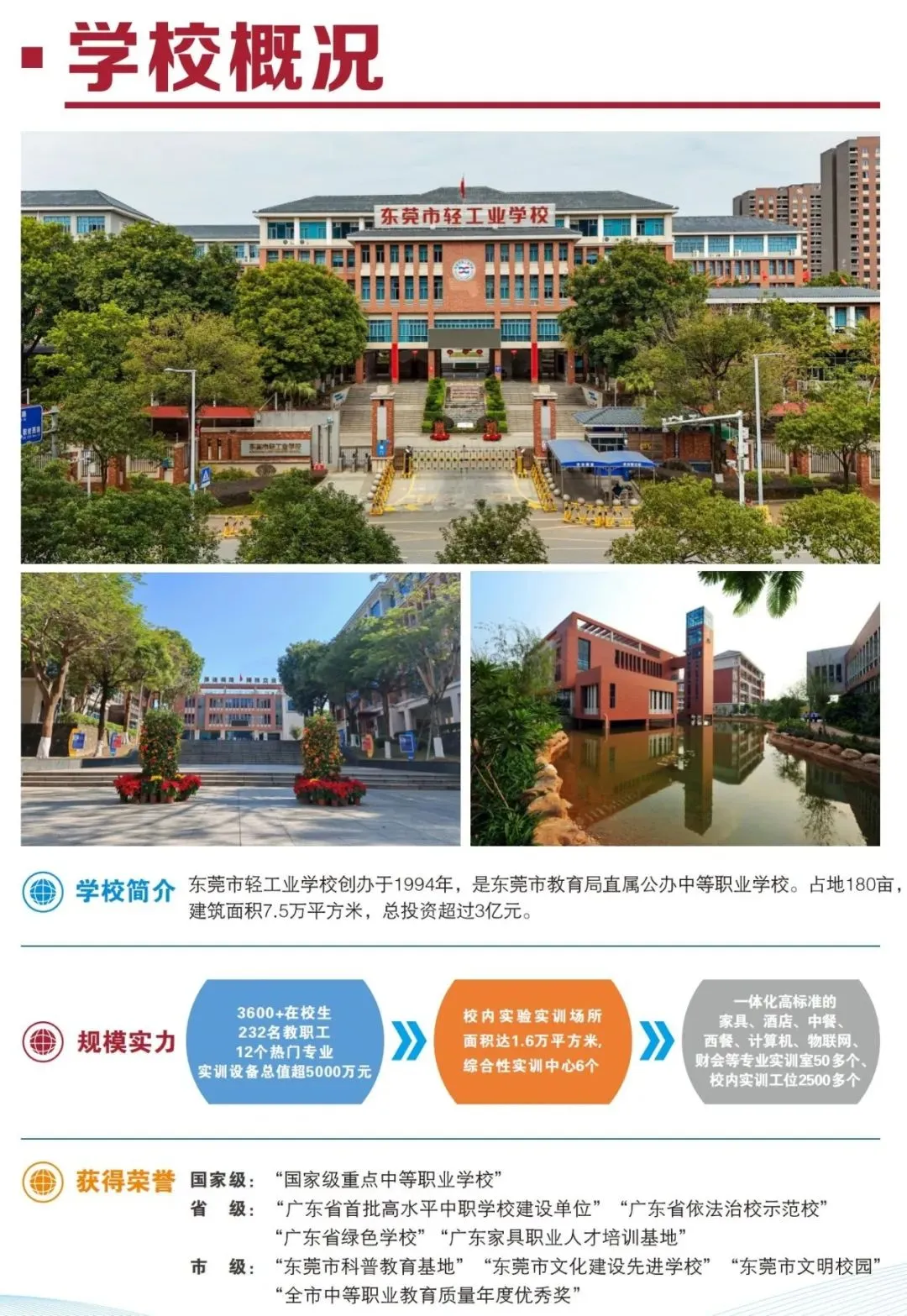 东莞市轻工业学校 1994 年创办,前身为厚街专业技术学校,是东莞教育局直属公办国家级重点中职、省高水平中职建设单位,占地 180 亩,在校生 3600 余人。开 11 个专业,家具设计与制作、中餐烹饪等 3 个省 “双精准” 示范专业,建 4 大实训中心 50 余间实训室,设备总值超 5000 万元,“双师型” 教师占比 82.5%。与 94 家企业校企合作,开 “三二分段” 贯通培养,升学就业率 99% 以上,获多项省级以上荣誉,符合条件学生享国家免学费政策。