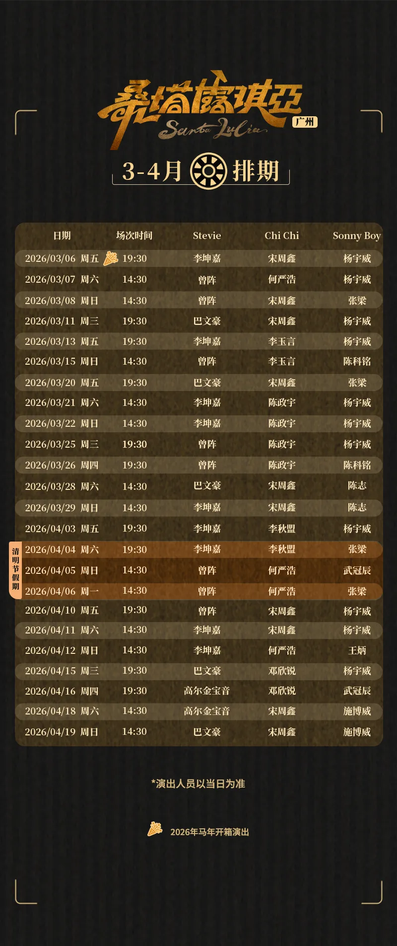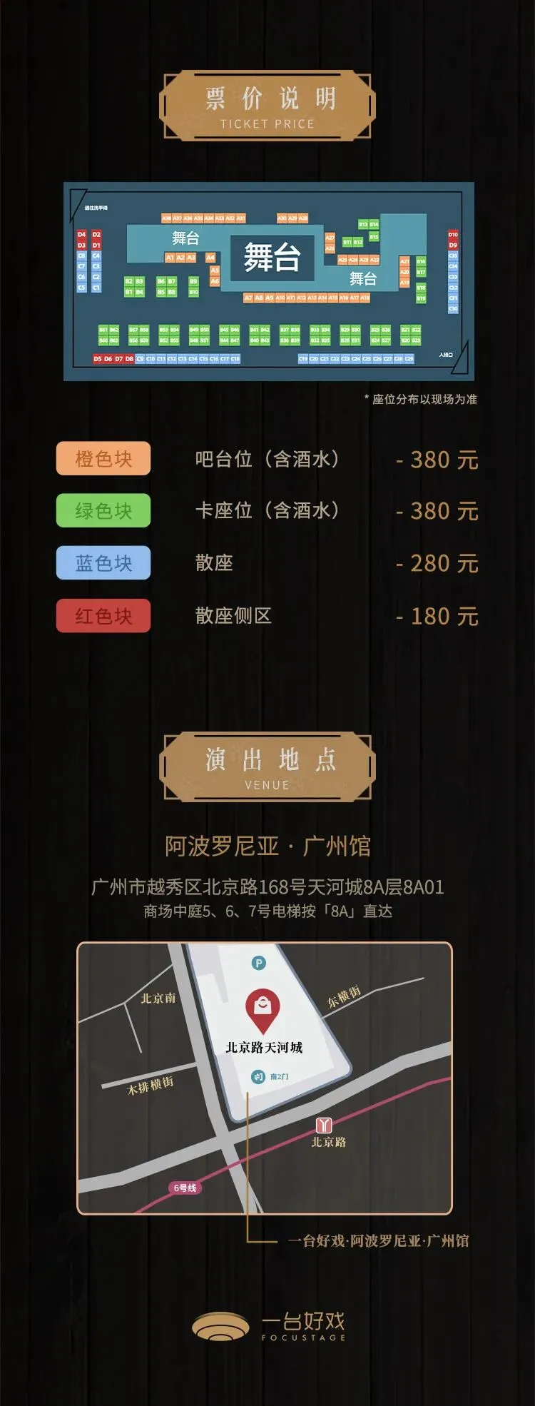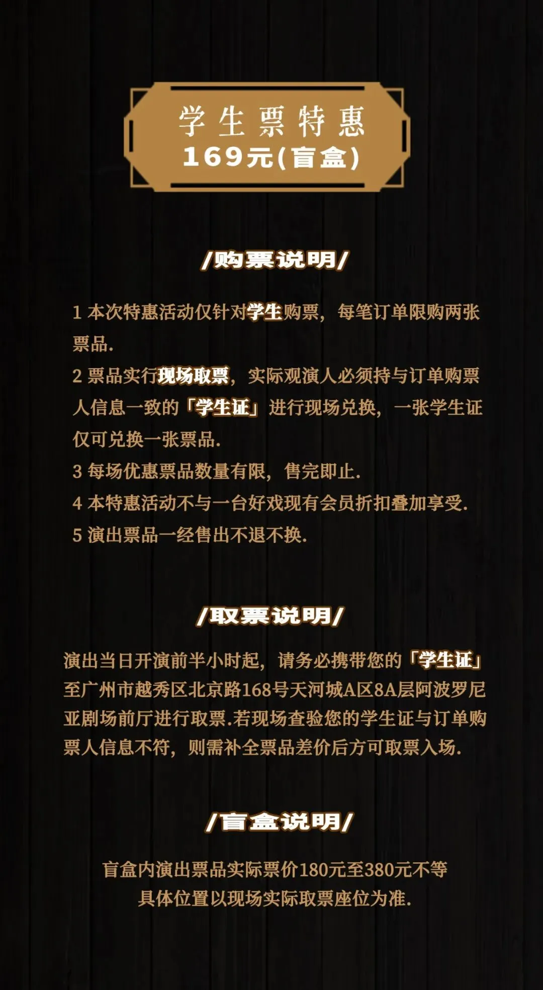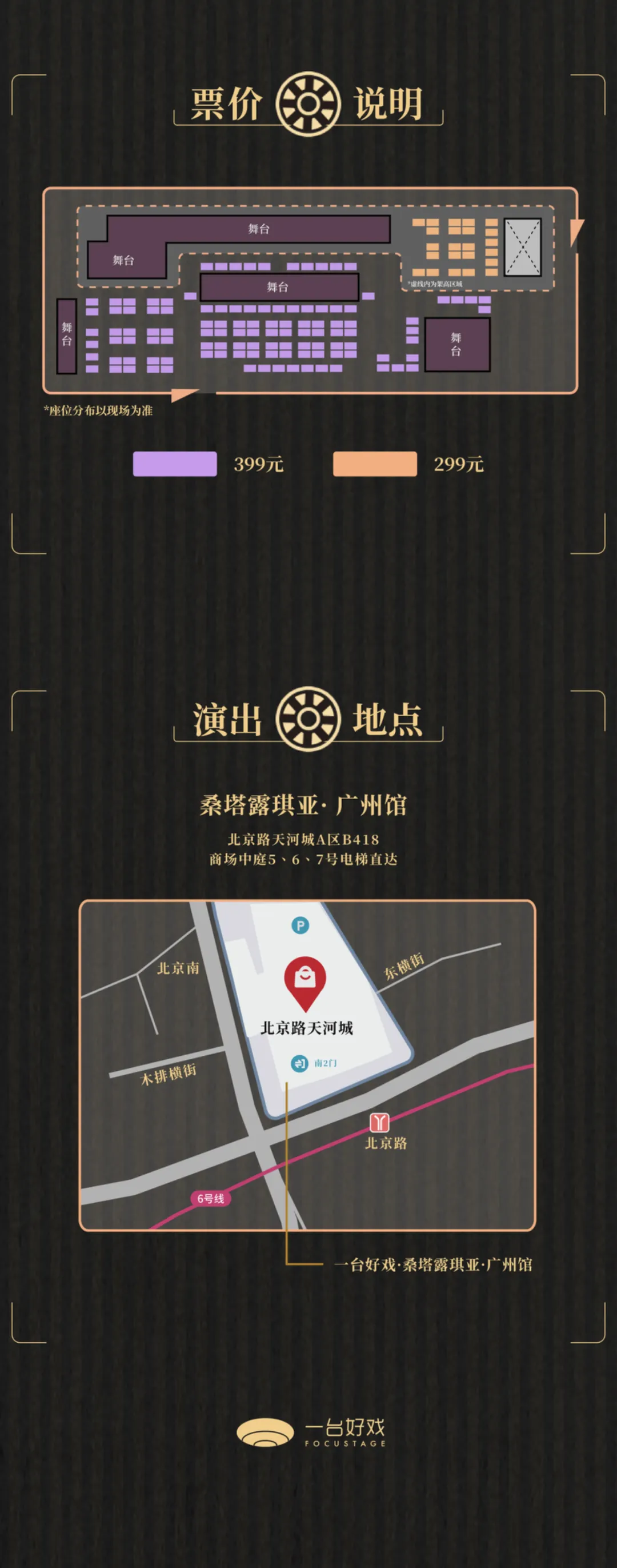 7. 演出设有迟到点,由于演员候场和演出动线需要,迟到观众需在场外等候片刻,待工作人员通知入场再行入场。中途离场观众同样须在场外等候,待入场通知后再入场。请合理安排您的出行时间,谨防迟到。