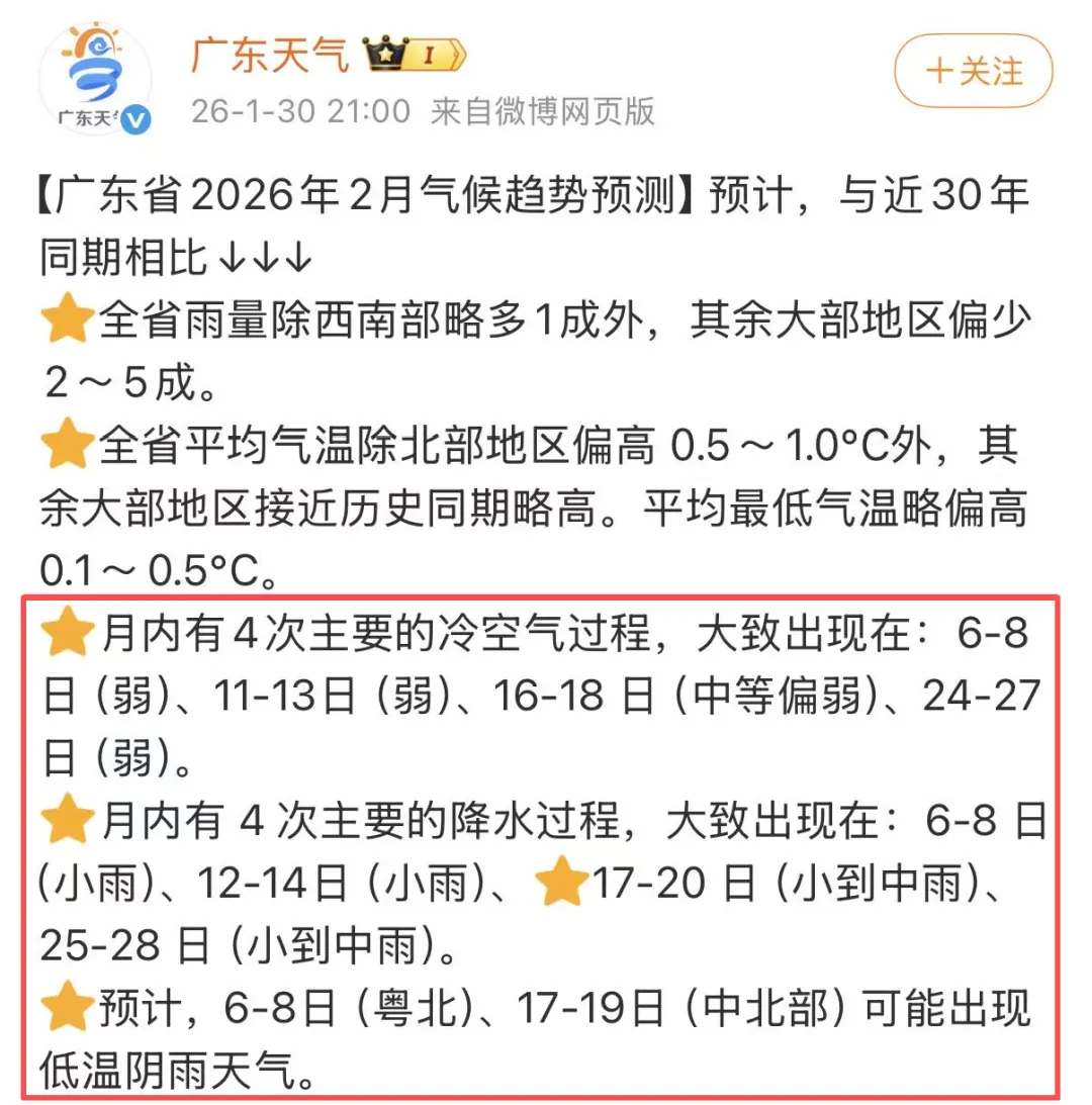 2月4日,西部市县多云,早晚有轻雾或雾,其余市县晴到多云。最低气温:粤北、珠三角北部市县6~10℃,南部沿海市县13~18℃,其余市县10~13℃。