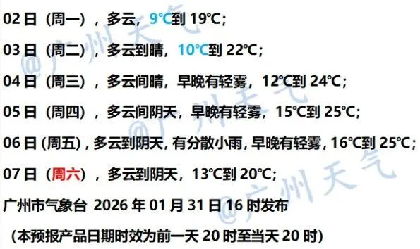 春节假期(2月15日至23日),广州多云为主,中后期有雨雾天气,出现强冷空气和持续寒冷天气的可能性低。