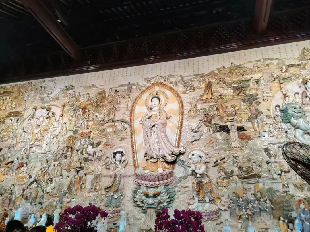 殿内造像与壁画:大雄宝殿内供奉着三尊6米高、重达10吨的铜铸佛像,正中为释迦牟尼佛,左侧为药师佛,右侧为阿弥陀佛,均跏趺坐于莲台,背光饰以大鹏金翅鸟及龙子龙女浮雕,庄严殊胜,这三尊铜佛是清代铸成的岭南大佛之冠,也是广东省内现存最大的古代黄铜铸像。殿后“观音法界”玉雕壁画,长20米、高7.9米,采用20余种天然玉石,以国家级非遗彩玉镶嵌工艺精制而成,展现观音三十二应身及善财童子五十三参典故,堪称艺术瑰宝。