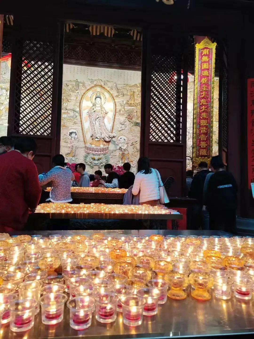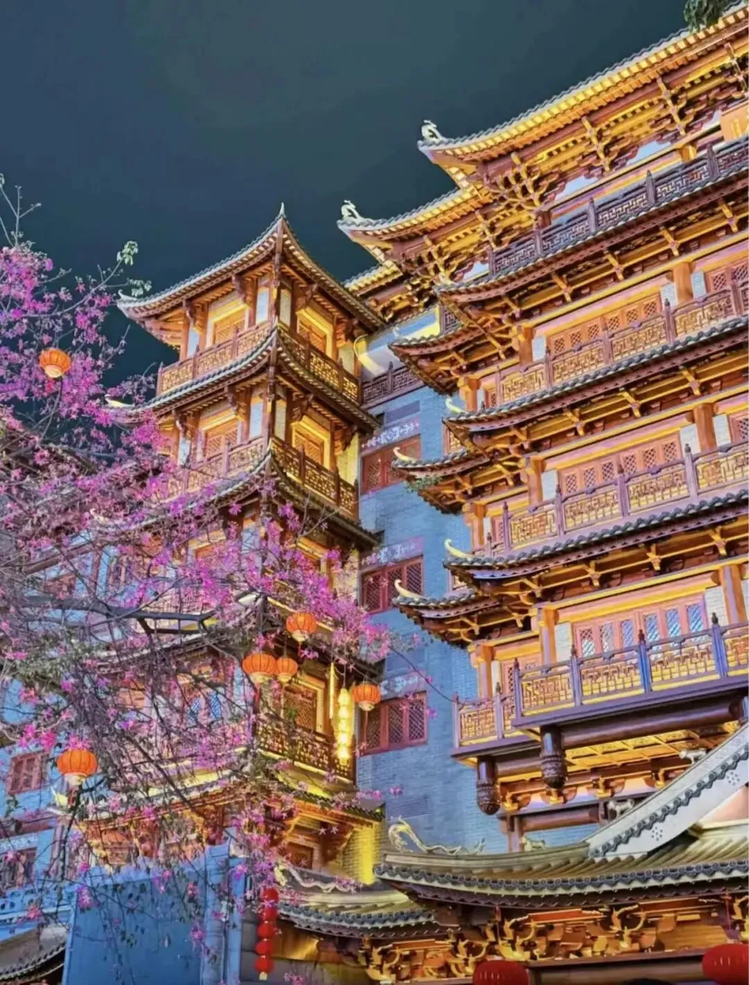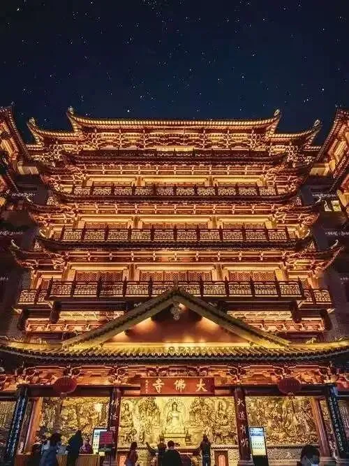 夜景加分项:每晚19:00-21:00寺院亮灯,19:00-20:00还有灯光秀,暖黄色的灯光勾勒出殿宇的飞檐翘角,琉璃瓦在灯光下熠熠生辉,与周边的摩登楼宇形成鲜明对比,古风与现代感碰撞出独特韵味,是拍照打卡的绝佳时机,建议穿浅色衣物,避开人群,拍出氛围感大片(注意:可拍照,但禁止拍摄佛像)。