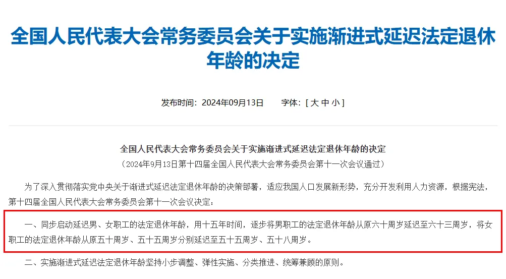 根据《全国人民代表大会常务委员会关于实施渐进式延迟法定退休年龄的决定》,同步启动延迟男、女职工的法定退休年龄。