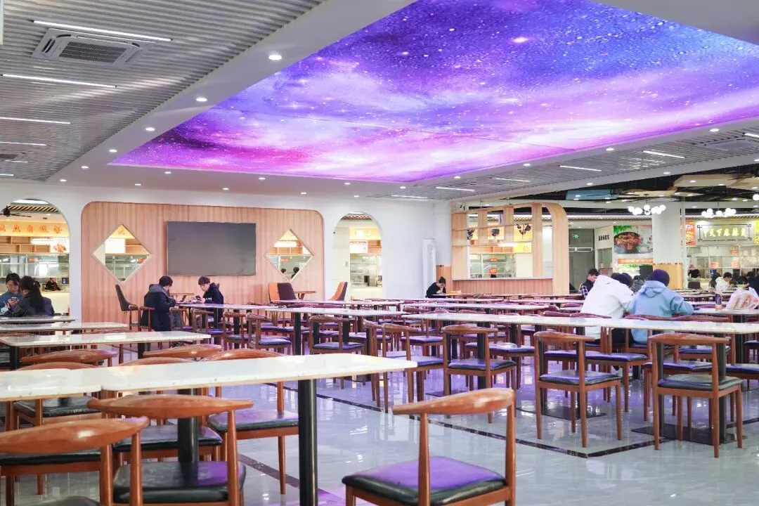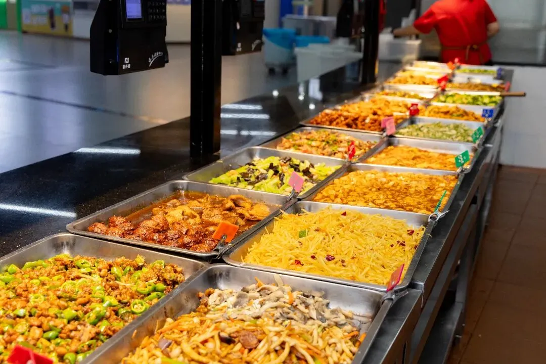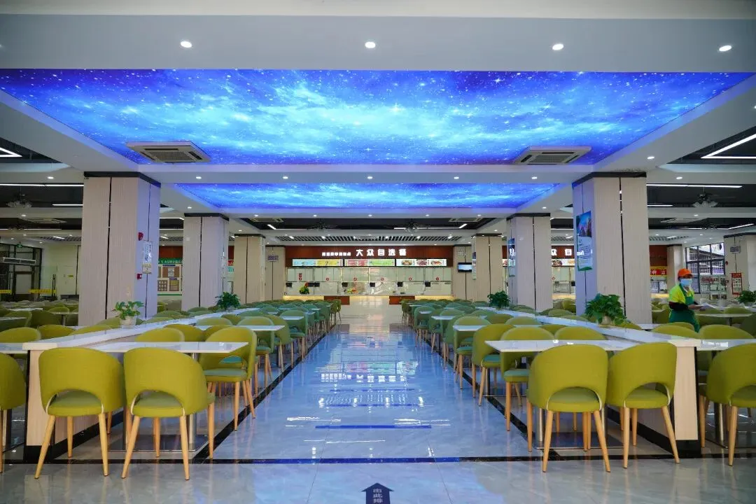 学校有5家学生食堂,3家校园超市,1家肯德基、多家水果、奶茶店和茶餐厅等等,学生食堂50多个窗口随你选择,满足你天南地北的口味,从周一到周五吃的都可以不重样!