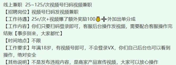 (平台特别提示:若实际工作内容与岗位描述不符合,请勿参与!并及时向平台反馈!请勿参与洗钱、刷单等违法犯罪兼职!)切记:不要交任何费用,收费的都是骗子!