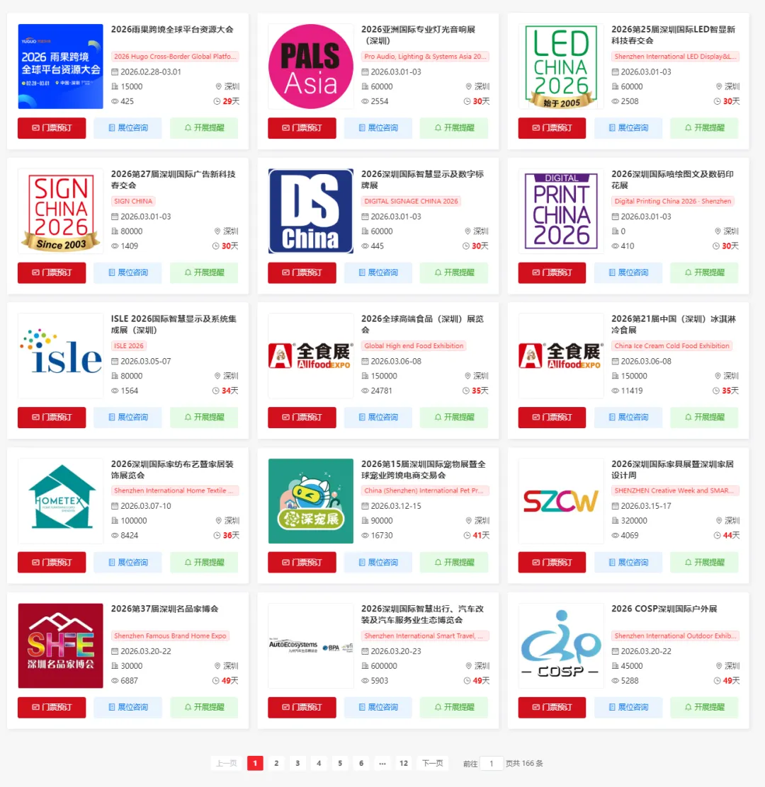 2026年深圳将举办多场重要的展会活动,涵盖了跨境电商、照明、印花、广告、显示、食品、家纺、宠物、家具、户外、汽车、自行车、汽车配件、房车、钓具、婚博会、内衣、消费电子、工业、消费电子、玩具展等多个领域。小编为大家整理了2026年深圳展会排期表,希望能帮助你规划行程。末文获取2026年深圳展会门票/展位预约入口~(大多门票限时免费)