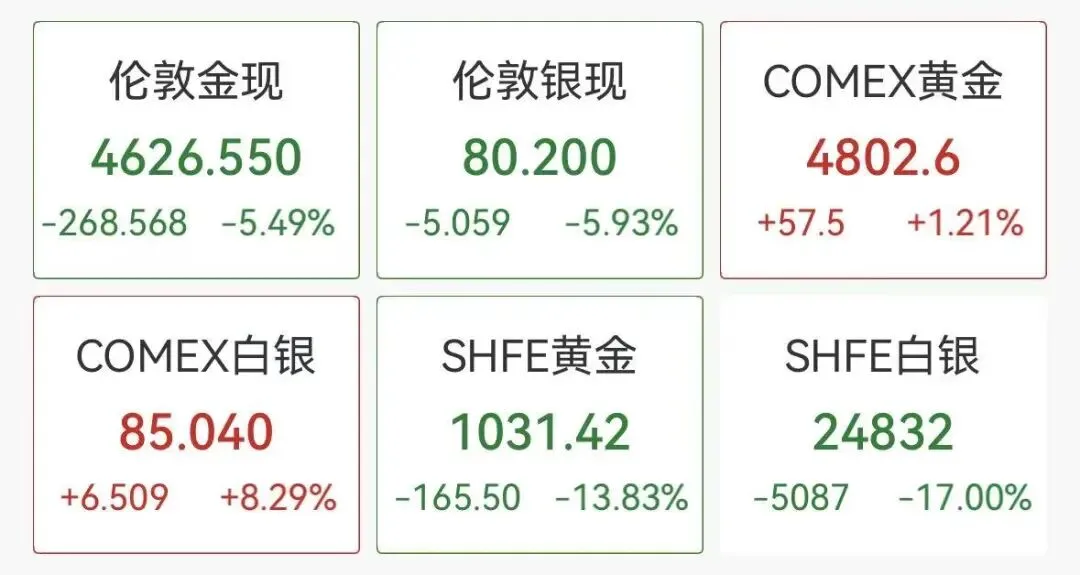 9:12左右,黄金、白银再次出现大跳水,现货黄金失守4590美元关口,一度跌至4583美元,现货白银也一度失守80美元关口,COMEX黄金涨超1%,报4802美元/盎司,COMEX白银期货涨超8%,报85美元/盎司。