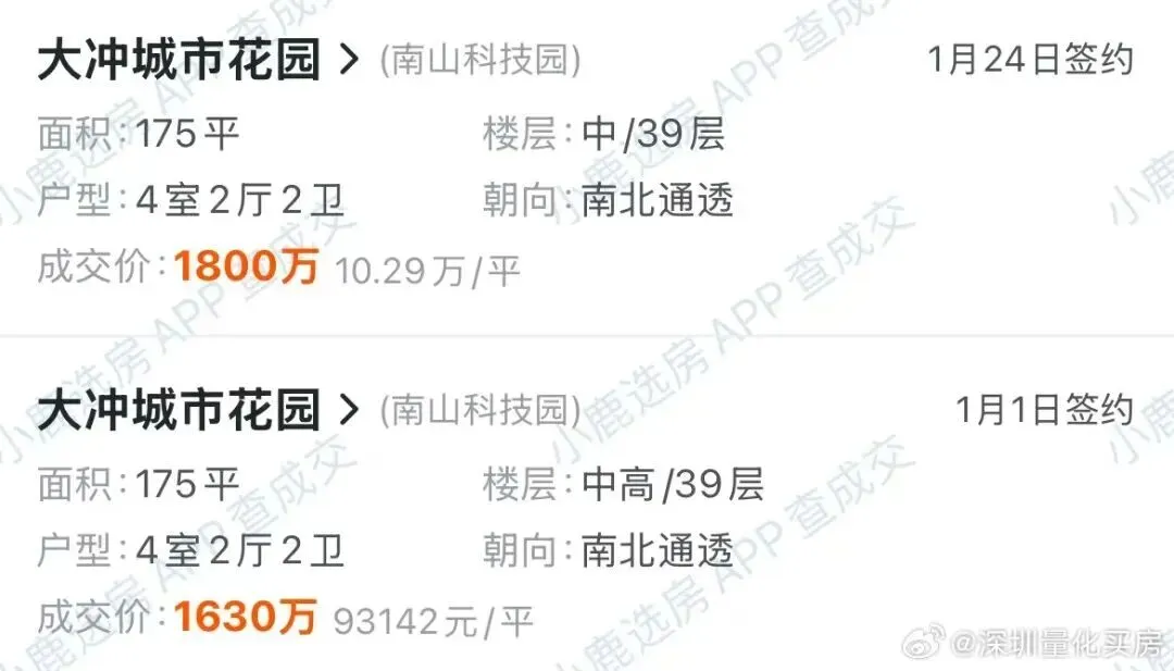 在大冲城市花园,同样是175㎡的大四房,1月初成交价大概在1630万,到了月底,一模一样的户型竟然卖到了1800万。短短一个月,涨了170万!