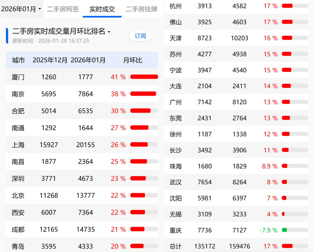 全国的数据也显示,1月份很多重点城市的成交量都在环比上涨,其中有11个城市涨幅超过20%。看来,一股小小的回暖潮似乎在多座城市蔓延。