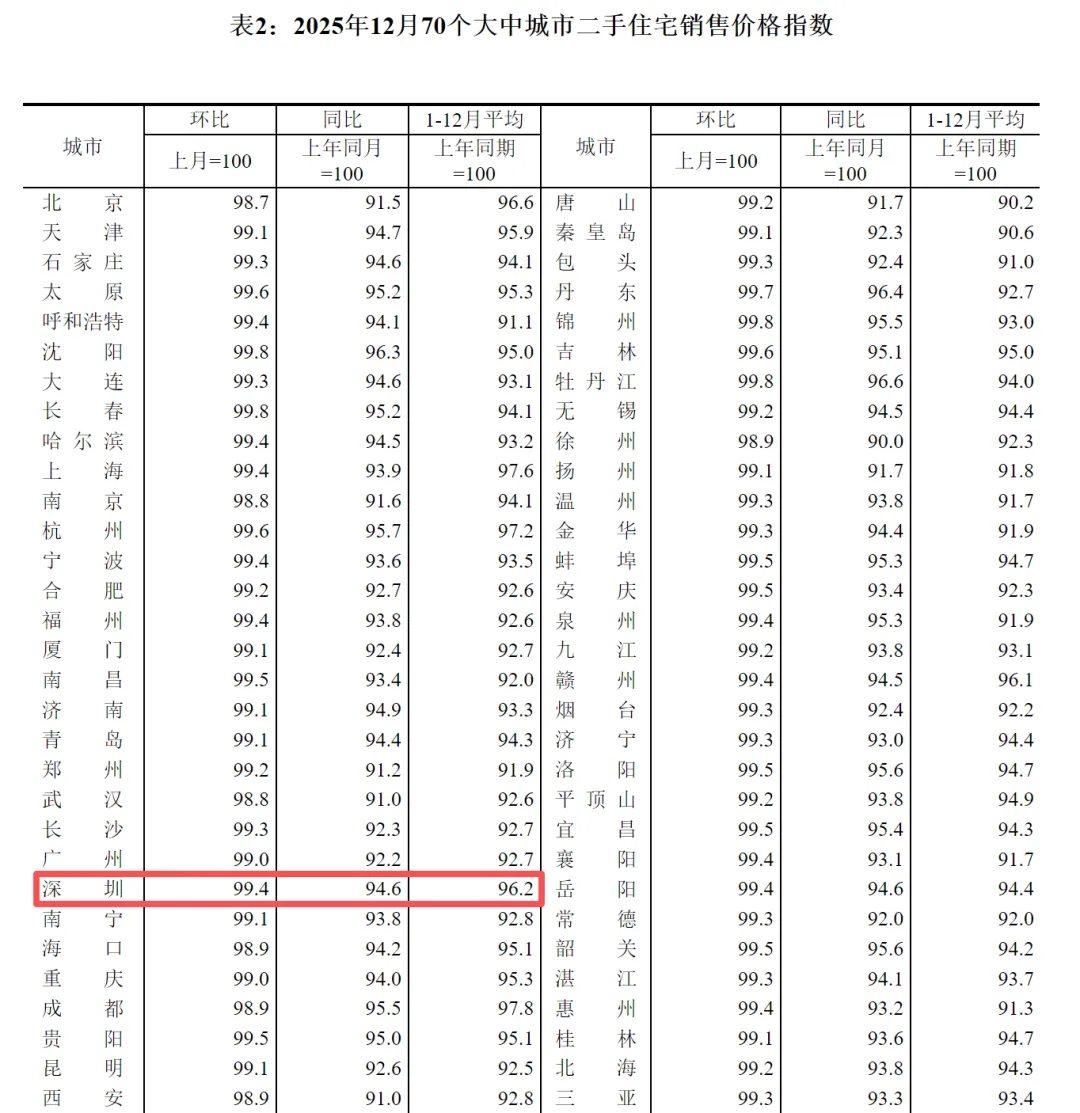 最重要的一个信号是,整体房价还没真正稳住。国家统计局的数据显示,去年12月深圳的二手房价环比还是跌了0.6%。也就是说,虽然少数核心区、优质盘在涨,但大部分普通房子可能还在阴跌。市场分化非常严重,是“核心区回暖,边缘区承压”的局面。