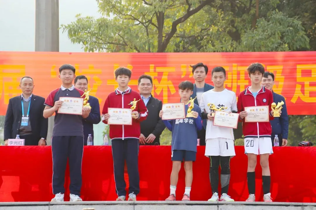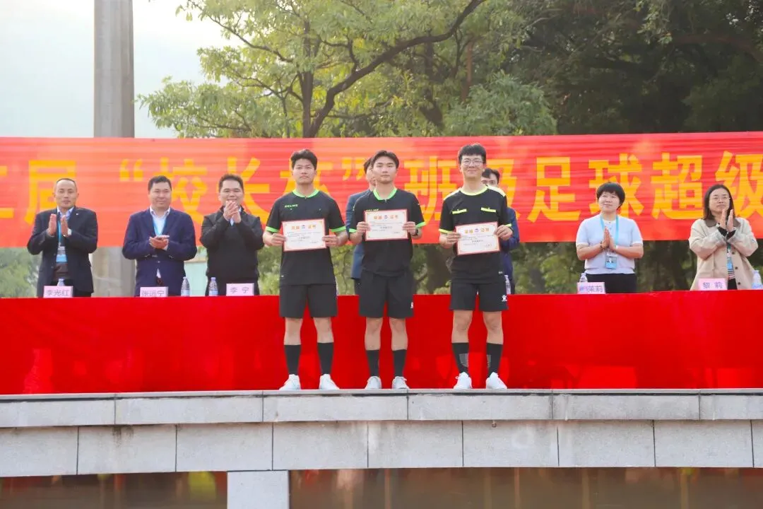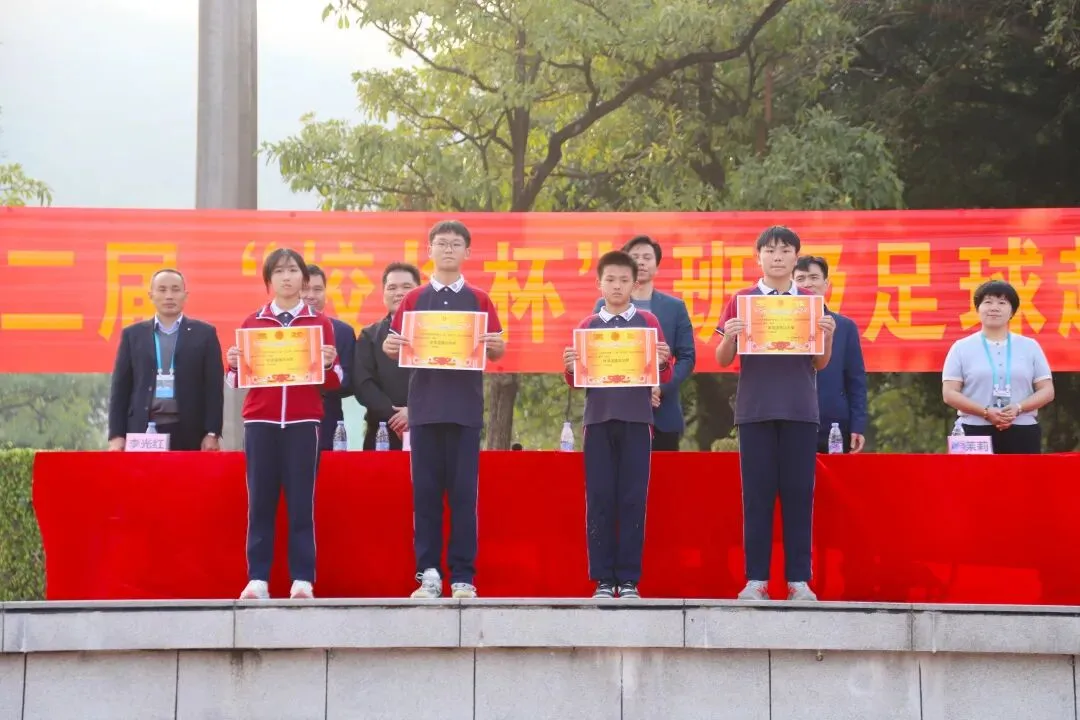 裁判长陈敬平老师庄重宣读获奖名单,现场颁发了“体育道德风尚奖”、“八强班级”“殿军、季军、亚军、冠军”等团体奖项,以及金靴奖、最佳门将、最佳球员,优秀裁判员等个人奖项。获奖代表接过荣誉证书与奖杯,定格荣耀瞬间。