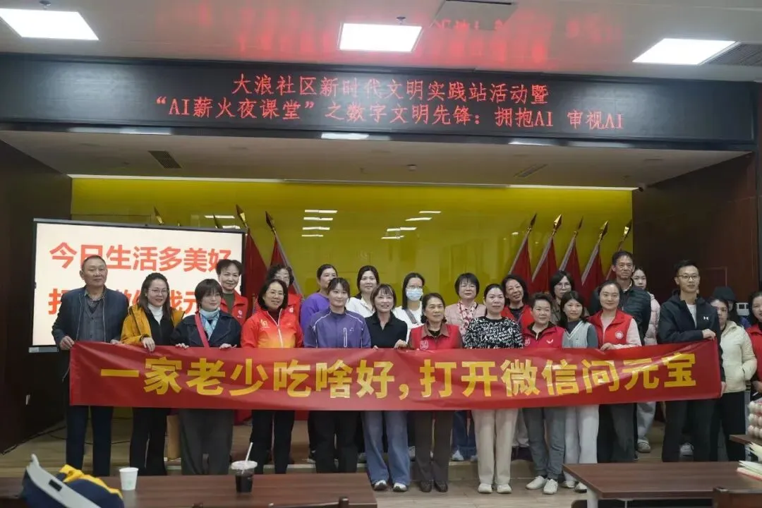 让理论真正扎根,社区成为关键土壤。中心组建“数字文明先锋队”,面向人民群众发起“AI在社区——人工智能通识教育行动”,先锋队用通俗易懂形式向社区居民科普人工智能等知识,目前已走进深圳新安街道11个社区,累计为近千名群众授课及答疑解难,填补AI素养社会教育的不足,让网络文明素养真正“飞入寻常百姓家”。