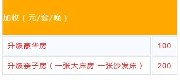 · 升级房型加收政策:升级豪华房 加收100元/间/晚, 升级亲子房(1张大床 1张沙发床) 加收200元/间/晚