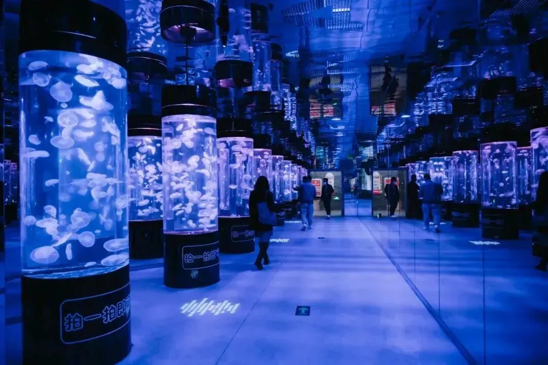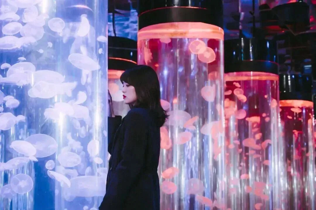 站在这些发光的柱子中间,四面八方都是游动的水母