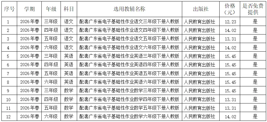 为科学规范做好教辅材料评议、推荐和选用工作,严格落实上级教育主管部门相关要求,建立长效工作机制,按照“一科一辅”的原则,东莞市南城阳光小学2026年春季教辅材料拟使用以下教辅,现将教辅名称、版本、定价等公示如下,接受家长和社会监督。