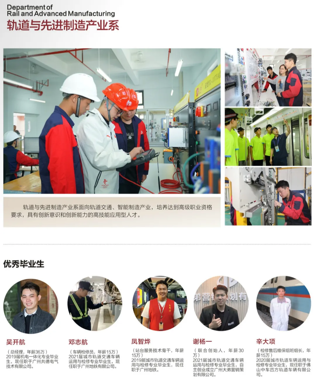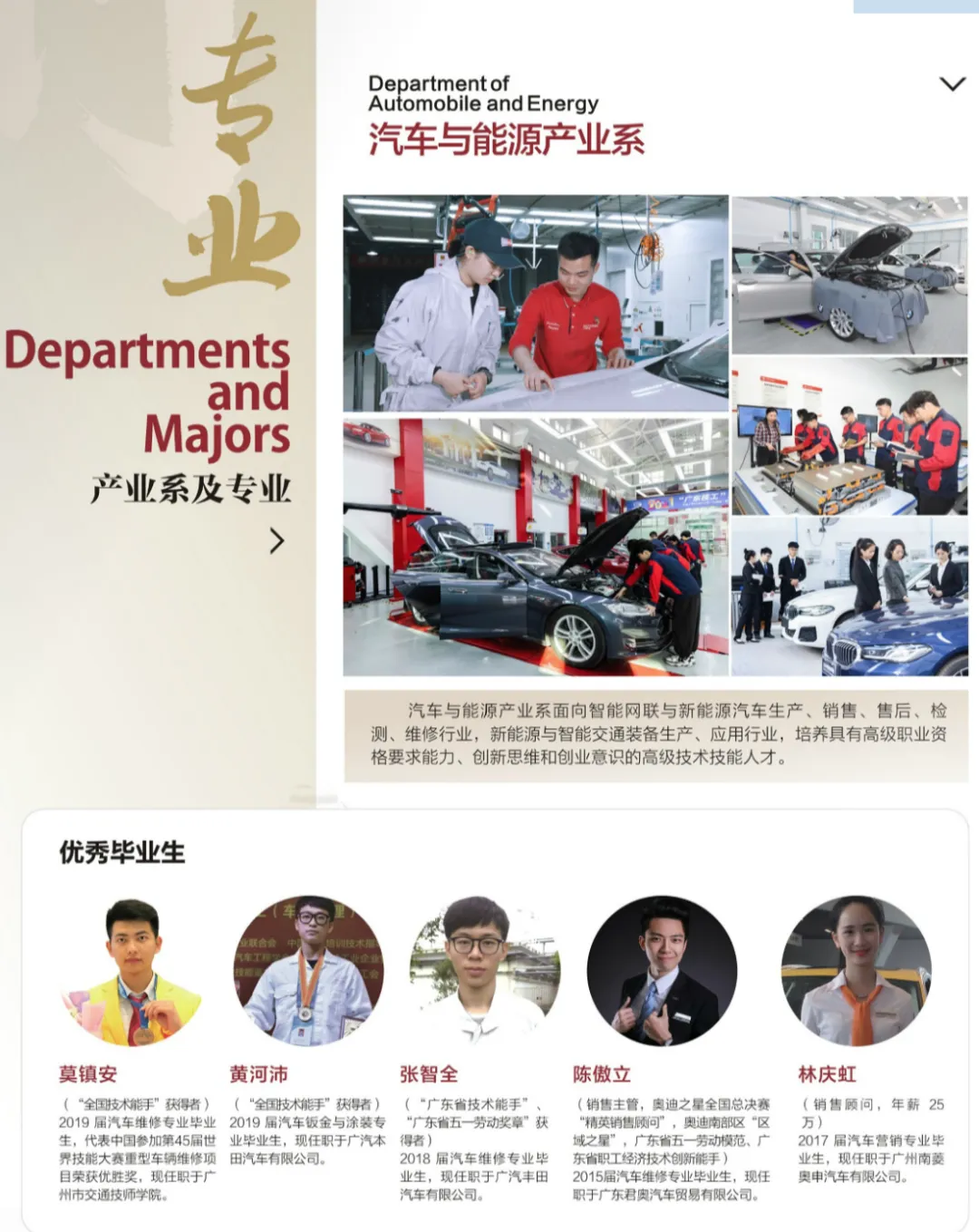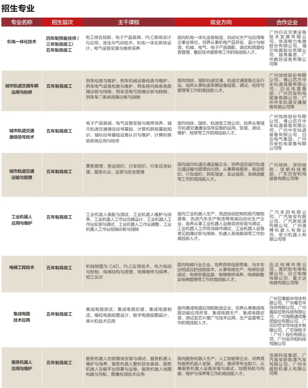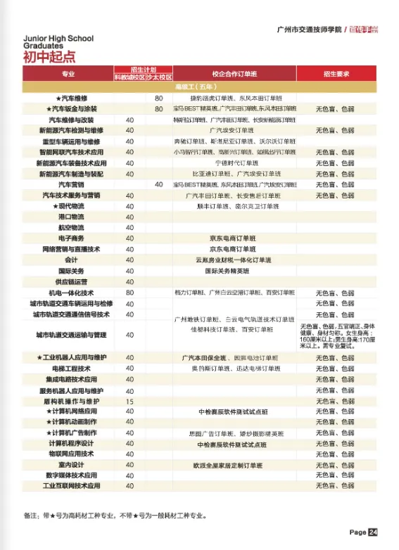 广州市交通技师学院(广州市交通高级技工学校)是一所公立国家重点职业院校,创办于1978年,是一所以培养高技能人才为主,集职业教育、职业培训、技能鉴定和就业服务为一体的多功能、多层次、具有交通行业背景的综合性职业院校。学院坚持校企双制办学,持续开展校企合作、产教融合,先后与宝马、奥迪、东风标致、现代、博世、联想、美的、阿里巴巴、美国宣伟等世界500强企业以及珠三角地区的近千家企业建立了长久纵深高技能人才“校企双制”培养模式合作。