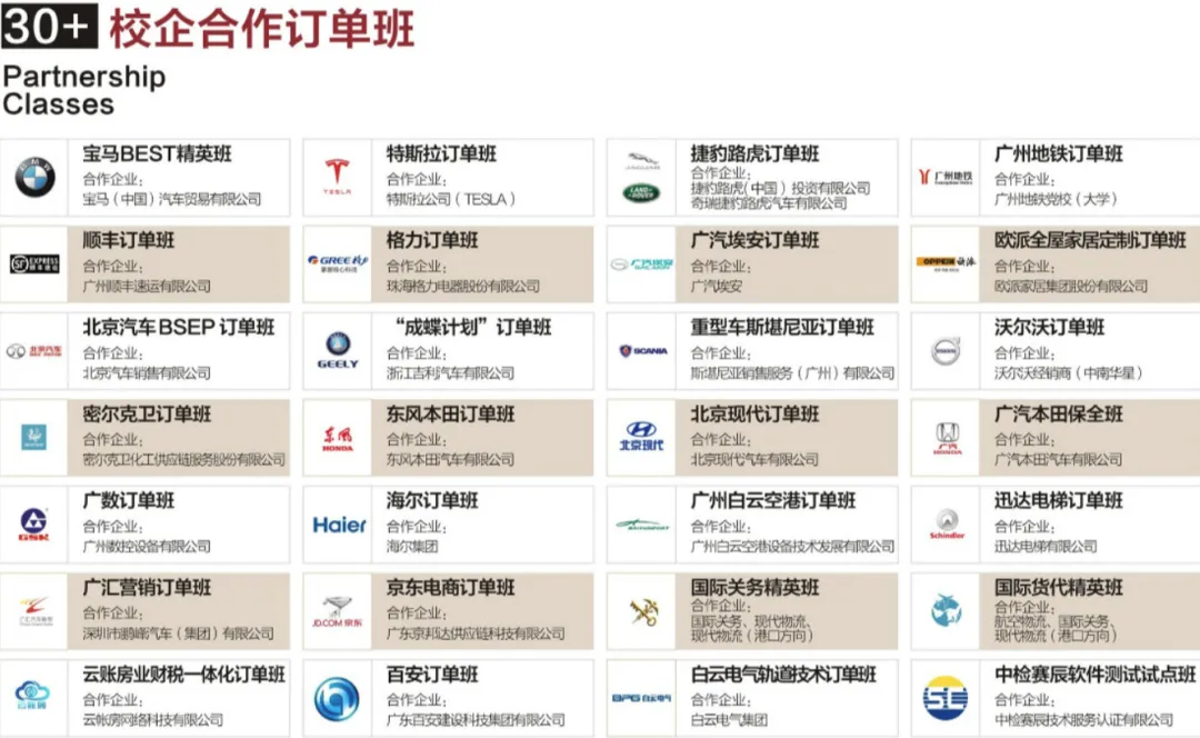 学校与超过1000家企业建立了合作关系,与宝马、广汽埃安、广州地铁、京东、顺丰等名企共建订单班和实训基地,确保教学与岗位需求无缝对接。