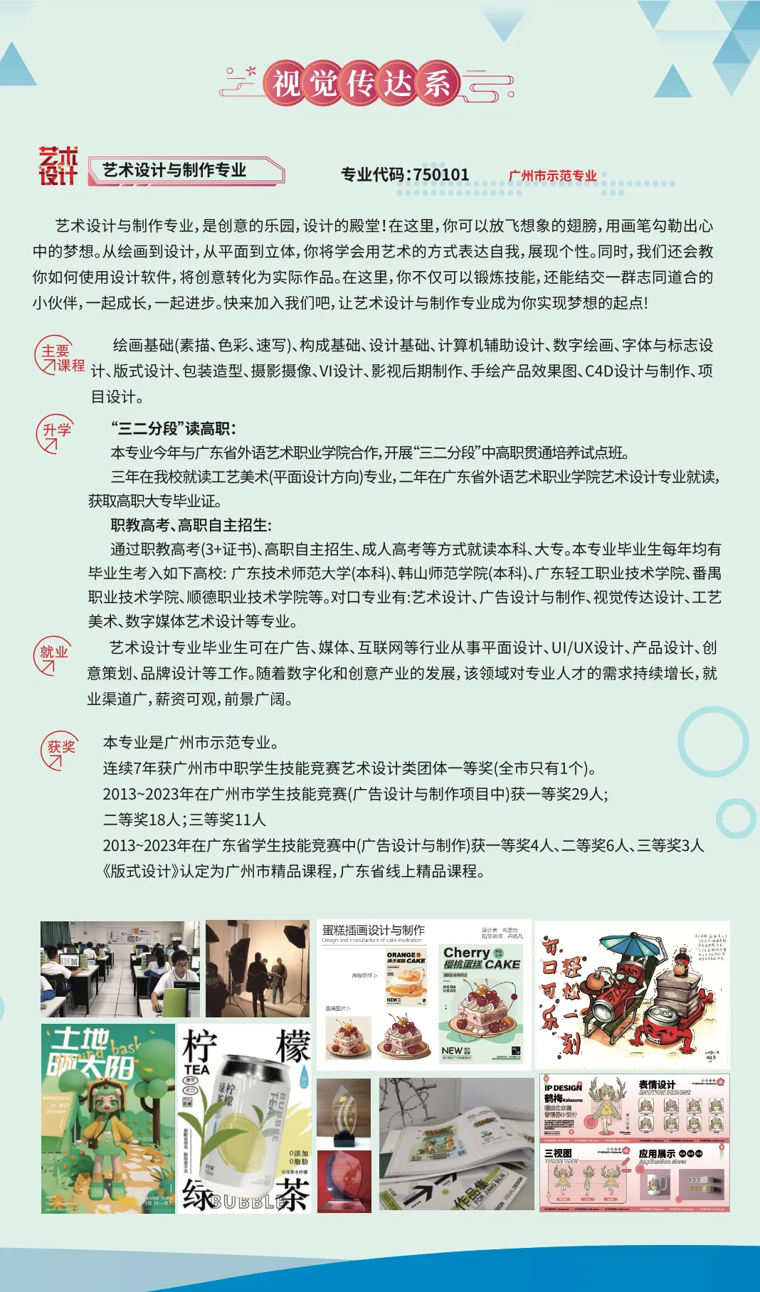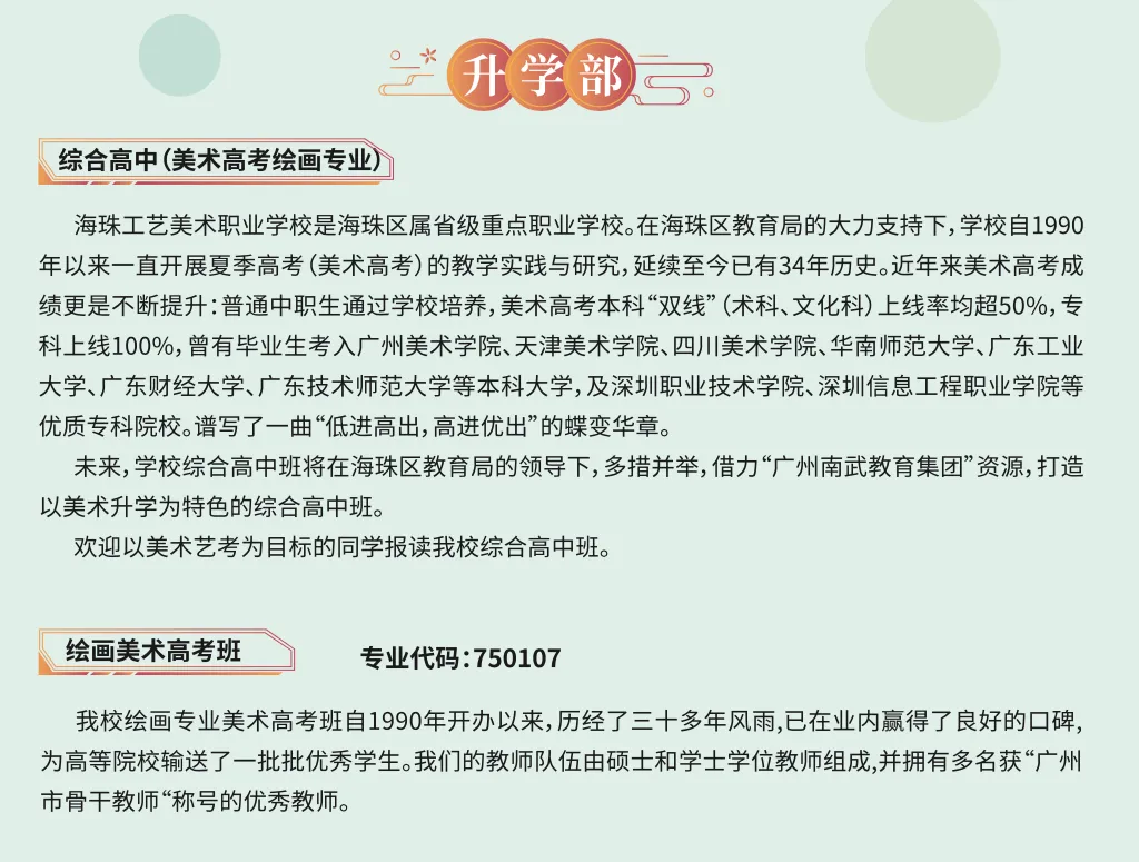 近年来美术高考成绩更是不断提升:普通中职生通过学校培养,美术高考本科“双线”《术科、文化科》上线率均超50%,专科上线100%,并如愿考入广州美术学院、天津美术学院、四川美术学院、华南师范大学、广东工业大学、广东财经大学、广东技术师范大学等本科大学,及深别职业技术学院、深圳信息工程职业学院等优质专科院校。请写了一“低进高出,高进优出”的蝶变华章。
