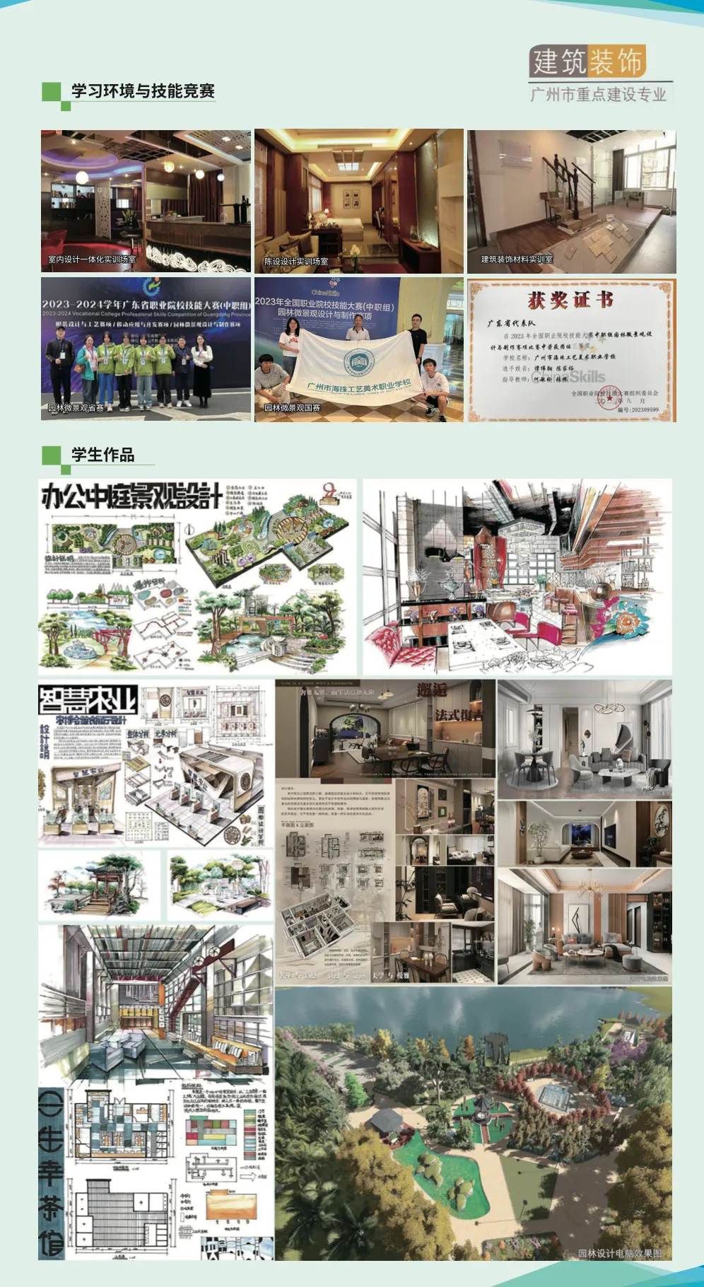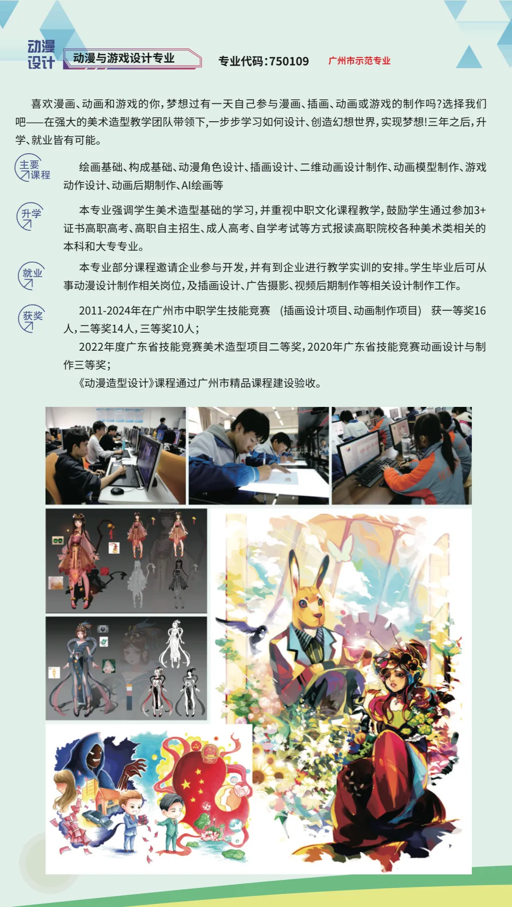 学校是 广州市唯一一所以培养工艺美术设计人才为主 的美术类职业学校35。其 建筑装饰专业 是广州市首批重点建设专业, 工艺美术专业 群是广州市示范性专业10。学校开设了绘画、工艺美术、艺术设计与制作、建筑装饰技术等多个专业。