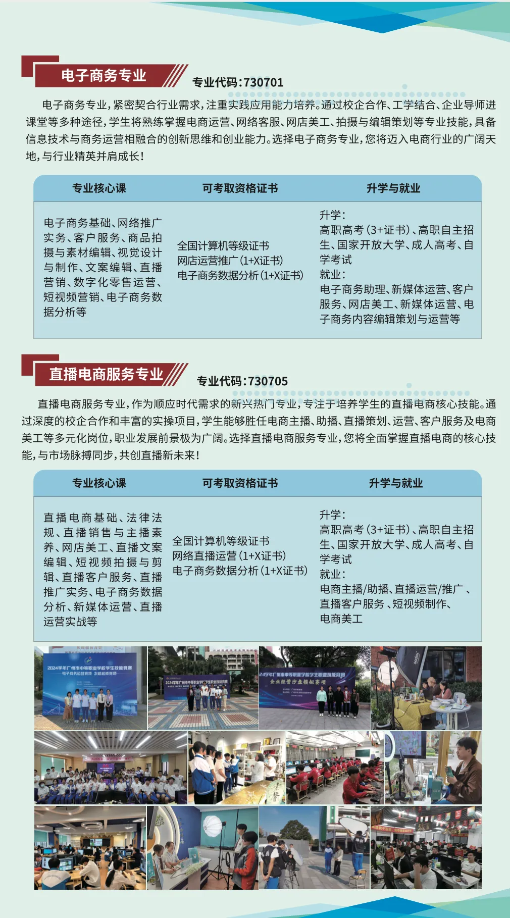 综合高中:2024 年起,学校成为广州综合高中试点校,在中考第四批次面向本区招生。学生通过中考录取到综合高中后,建立普通高中学籍,高一学习以普通高中课程为主,同时修读职业认知模块课程。高一升高二时,学生可选择继续读普通高中,参加春季高考和夏季高考;也可申请转入中职专业就读,之后通过 “3 + 证书” 考试升学。通过广州市中招录取的中职学生,职一结束时,若中考分数达到当年普通高中录取最低控制线、本校综合高中学籍有空余、符合学分互认要求且通过学校测试,可转入综合高中班。