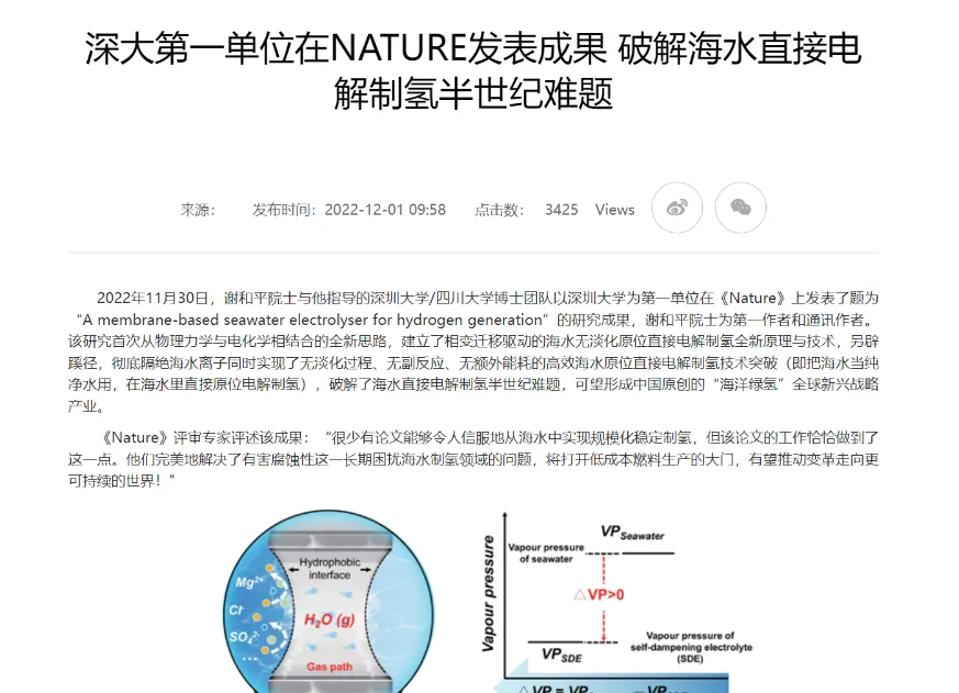 2022年,中国工程院院士谢和平教授与他指导的深圳大学、四川大学博士团队,以深圳大学为第一单位在《自然》杂志上发表了研究成果“新技术可在海水里原位直接电解制氢”,破解了困扰世界半世纪之久的难题。