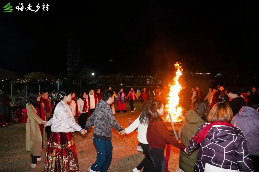 随着晚宴步入尾声,狮前壹号营地的篝火晚会点燃了整晚的最高潮。 推荐官们围火欢歌,在跳动的火焰和手牵手中,感受着彼此之间同频的心跳, 也沉浸在那份纯粹的乡村情怀中。这不仅是一场聚会,更是一场“文化归乡”。正如嗨走乡村创始人覃海洋所言,乡村的本质不仅是种地,更是“种人心”。
