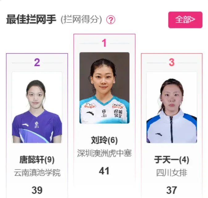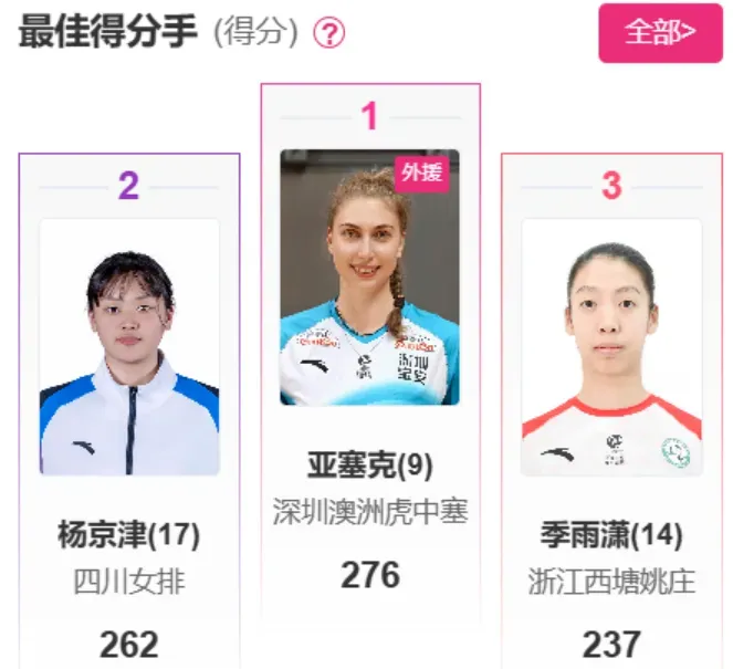 截至当前小组数据榜单,深圳澳洲虎中塞女排数位核心猛将强势领跑榜单,尽显团队竞技实力。波兰外援亚塞克右翼突击锐不可挡,不仅以276分问鼎最佳得分手(总得分)榜首,更以5.21(276/53)的得分效率位居最佳得分手(得分/局)次席,凭借234记扣球斩获最佳扣球手(扣球得分)头名,在接应榜单中亦稳居亚军之位。副攻刘玲拦网选位精准,以41分摘得最佳拦网手(拦网得分)魁首,以0.77(41/53)的拦网得分效率拿下最佳拦网手(拦网得分/局)冠军,同时稳坐副攻榜榜眼席位;主攻王逸凡扣球手法精巧多变,发球极具杀伤力,成功跻身主攻榜次席,同时以0.51(22/43)的发球效率斩获最佳发球手(发球得分/局)季军;二传陈馨彤盘活全队进攻体系,稳居二传榜榜眼之位。