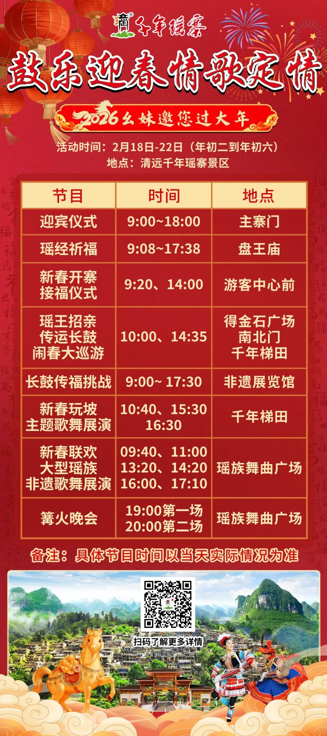 今年春节期间(2月18日-22日,年初二至年初六),千年瑶寨将举办盛大的“玩坡节”,这也是瑶族传统的情人节。活动内容丰富、仪式感十足,从早到晚精彩不断: