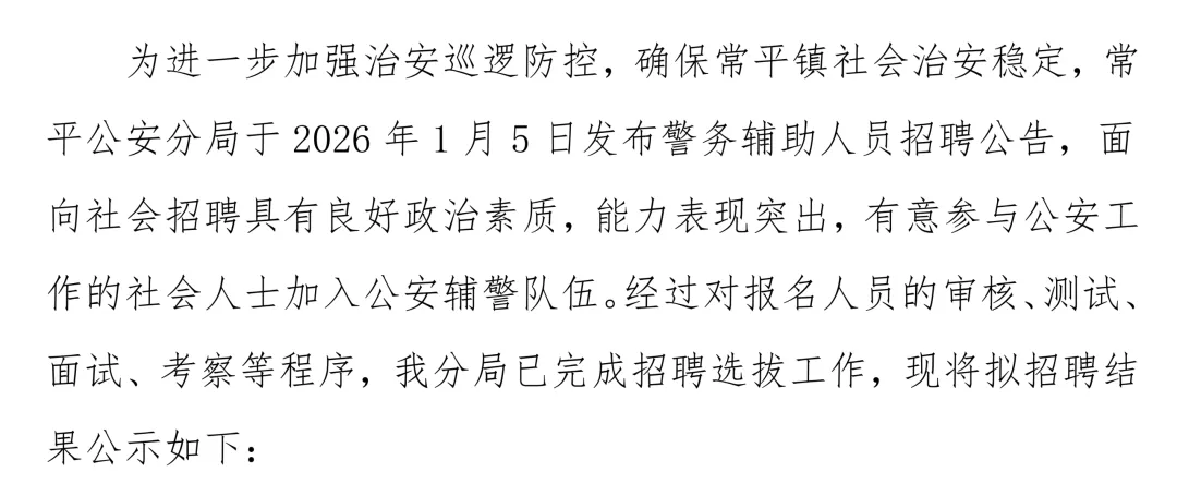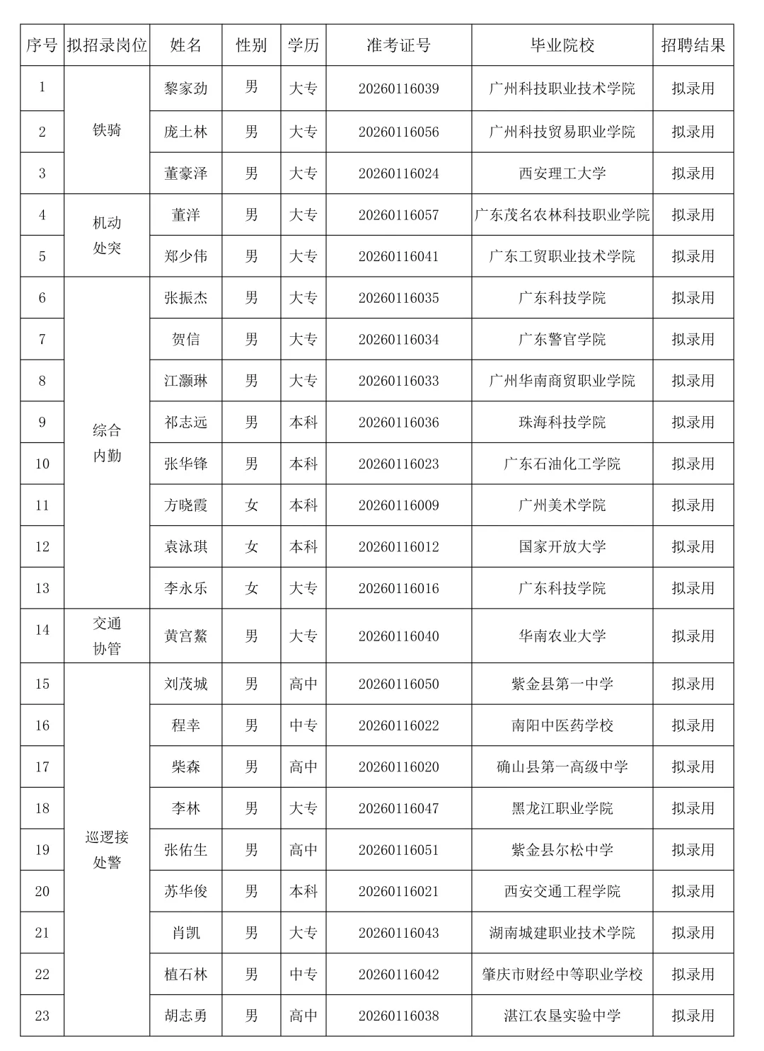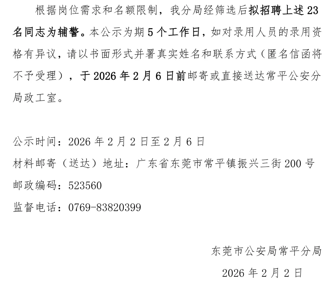 东莞市公安局沙田分局拟聘用警务辅助人员公示