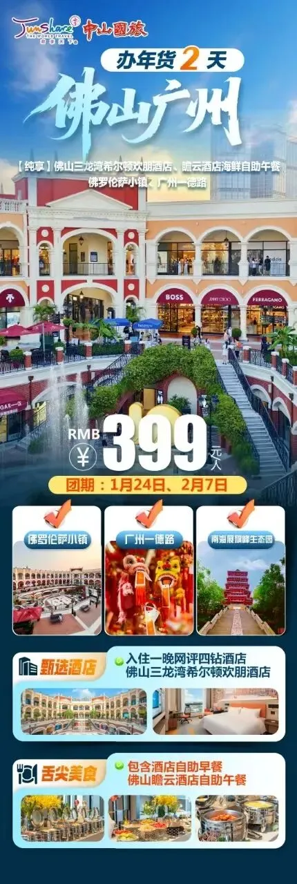 【2月7日即将成团】广州一德路办年货啦!玩转佛罗伦萨小镇,入住佛山三龙湾希尔顿欢朋酒店,品味瞻云酒店海鲜自助午餐,尽显人间烟火气~