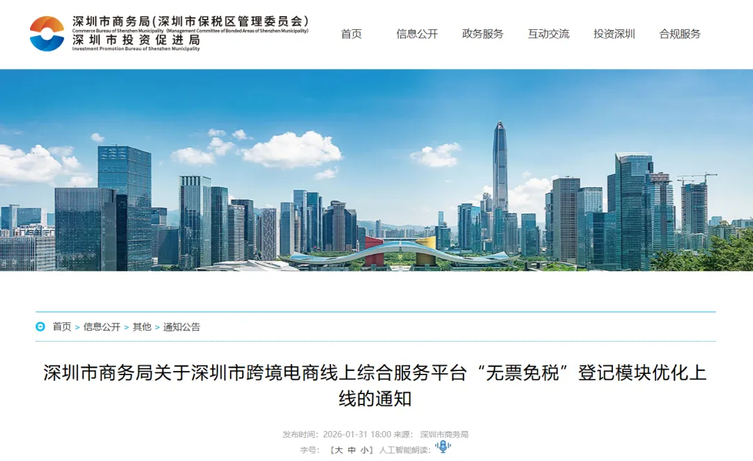 为贯彻落实《财政部 税务总局 商务部 海关总署关于跨境电子商务综合试验区零售出口货物税收政策的通知》(财税〔2018〕103号)等文件精神,我局结合深圳跨境电商产业发展实际,对深圳市跨境电商线上综合服务平台(以下简称“综服平台”)“无票免税”登记功能进行了优化升级。现将系统上线及相关事项通知如下: