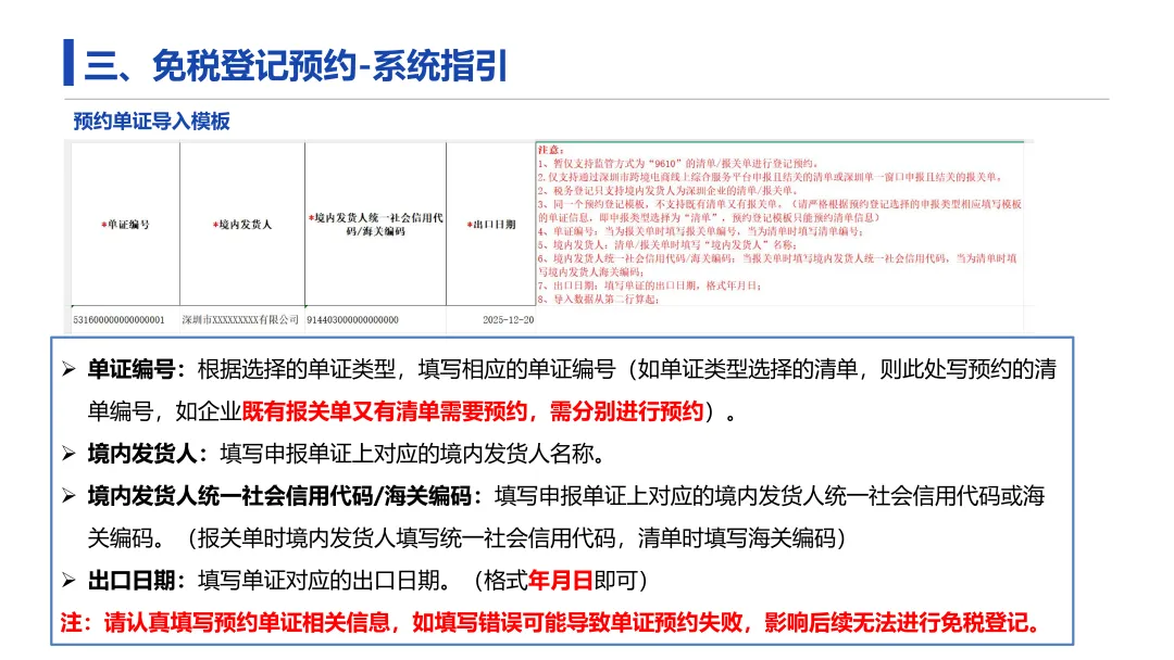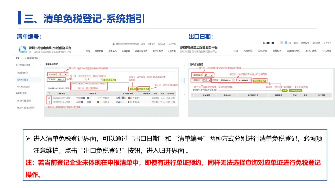 三、具体操作流程请参考《深圳市跨境电商线上综合服务平台“无票免税”登记操作指引1.0版》,建议企业合理安排时间,避开业务高峰时段,确保登记顺畅。