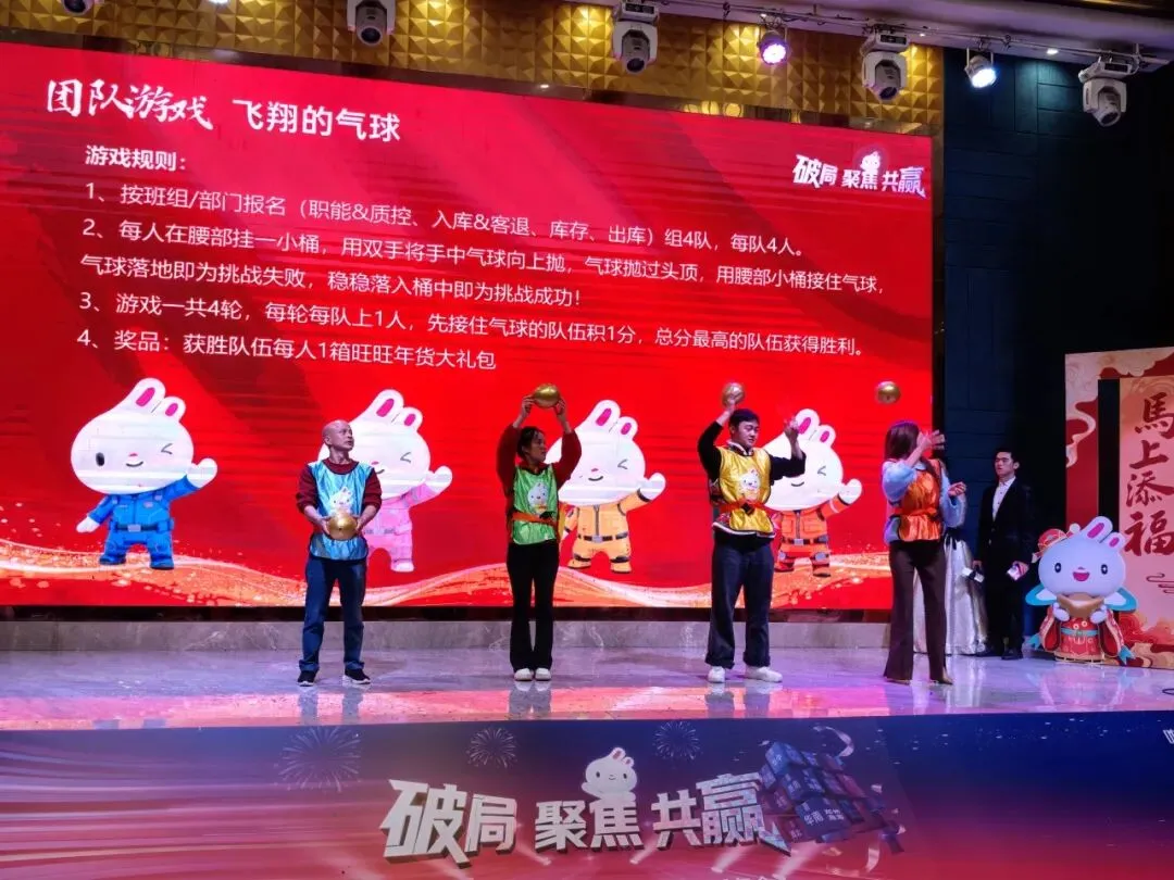 在晚会的尾声,游戏“飞翔的气球”让多支队伍同台竞技,气球飞舞间角逐激烈,尽显团队协作精神,最终诞生“最佳游戏王”。