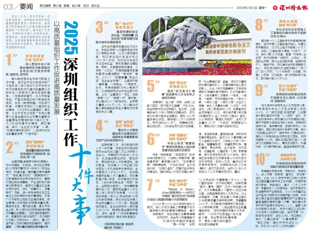 用众人之力,则无不胜也。过去的2025年,深圳组织系统牢牢把握高质量发展这一首要任务,连续第3年实施组织工作服务推动高质量发展“十项行动”,着力把广大党员、干部和各方面人才组织起来、凝聚起来,把组织优势转化为发展胜势,为深圳在推进中国式现代化伟大实践中走在前列、勇当尖兵提供坚强组织保证。