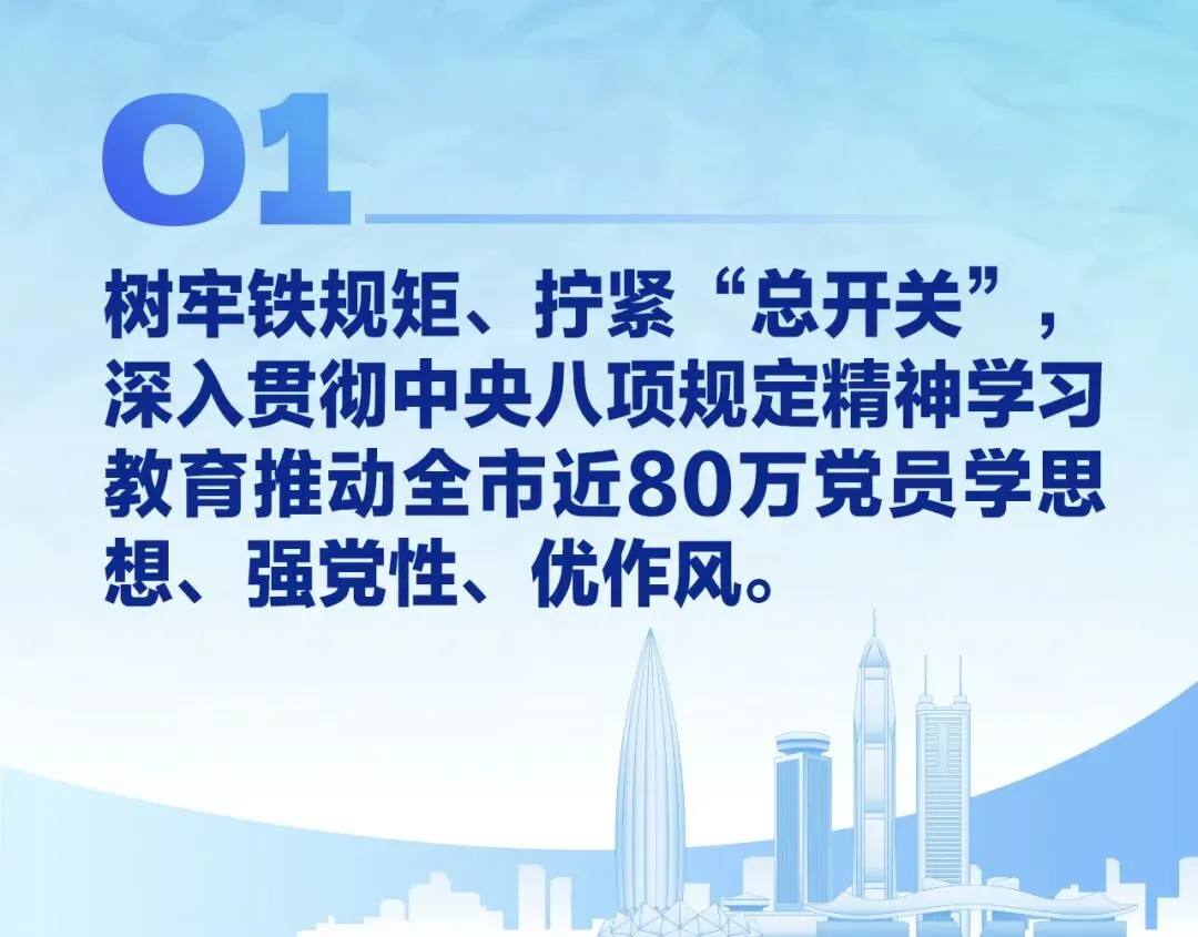 牵头制定落实全市学习教育工作方案,组织全市各级党组织和广大党员深入学习领会习近平总书记关于加强党的作风建设的重要论述和中央八项规定及其实施细则精神,一体推进学查改,派出市委督导组,严督实导推动学习教育走深走实,央视《新闻联播》对此进行报道。统筹抓好党的二十届四中全会精神、《习近平谈治国理政》第五卷、习近平总书记视察广东和出席第十五届全国运动会开幕式重要讲话重要指示精神的学习培训工作,引导全市广大党员干部更加坚定拥护“两个确立”、坚决做到“两个维护”。大力弘扬改革开放精神、特区精神,举办“企业家大讲堂”15期,“改革浪潮中的深圳”入选深圳网络正能量音视频“十佳作品”。
