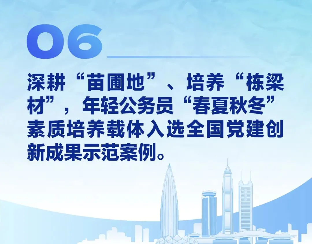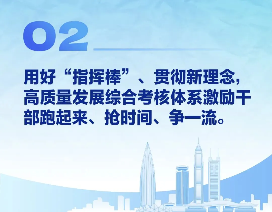 全面完整准确贯彻新发展理念,突出关键性、引领性,将对各区原有的28项考核事项统一归并为1项综合考核,构建涵盖“高质量发展关键绩效”“党的建设成效”“满意度评价”三张清单的综合考核指标体系,兼顾不同区域资源禀赋、产业结构和不同单位职责定位,差异化设置各区各单位考核目标,深化“知事识人、序事辨材”机制,进一步考准考实各区各单位工作实绩和干部干事表现,引导广大干部树立和践行正确政绩观,把主要精力放到推动实现高质量发展、高品质生活、高效能治理、高水平安全上来,助力深圳经济实现质的有效提升和量的合理增长。在中组部党建研究所、党建读物出版社指导下,成立新时代干部人才研究中心(深圳),着力打造干部人才研究高地和党建研究“南方重镇”,以高质量党建赋能高质量发展。