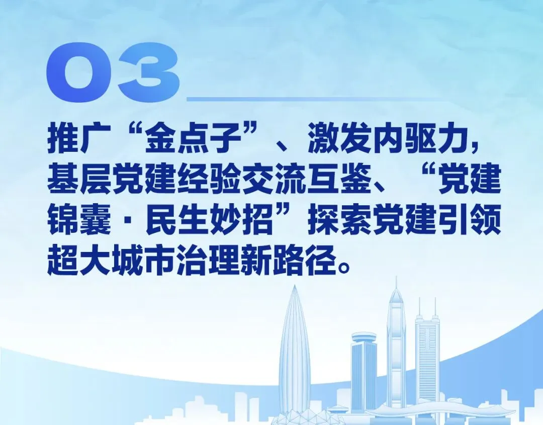 召开全市基层党建经验交流大会,来自各领域14位基层党组织书记代表现场发言、34位代表书面发言,市区街社四级党组织书记3200多人参加,形成各级党组织书记互学互鉴、联抓党建的治理格局。同时,发挥基层首创精神,分领域“小切口”挖掘破解基层党建和基层治理难题的“微创新”案例,2000个“党建锦囊·民生妙招”在全省全市推广,让基层干部一看就懂、一学就会、一用就灵。此外,开展党群服务中心提质行动,纵深推进民生诉求综合服务改革,上线“企事速办”专区,创新“每周一议”“每周一评”等机制,评议解决210个疑难诉求,全年服务量超4000万人次,努力解决好群众牵肠挂肚的民生大事和天天有感的身边小事。