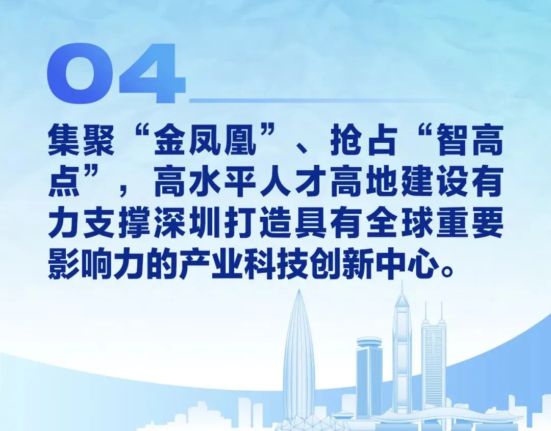 坚持党管人才,深化教育科技人才一体改革,市委召开科技创新委员会全体会议暨人才工作领导小组会议,专题研究科技与人才工作。扎实推进更加积极、更加开放、更加有效的人才政策落地,推动教育、科创等10个平台部门加快落实人才引进培养支持项目,全市高层次人才达2.8万人。加快推进国家战略人才力量建设,吸引集聚查尔斯·李波、丹扬等顶尖科学家,5名科学家新当选“两院”院士,全职院士超百人。加快集聚高端科创人才,国家和省重大人才工程入选人数创历史新高,1050名深圳学者入选2025年全球前2%顶尖科学家榜单,研究与试验发展人员全时当量达47.4万人年、居全国城市首位,全社会研发投入年均增长达12.9%、强度跃居全国城市首位,深圳-香港-广州创新集群在《全球创新指数》排名中跃居首位。