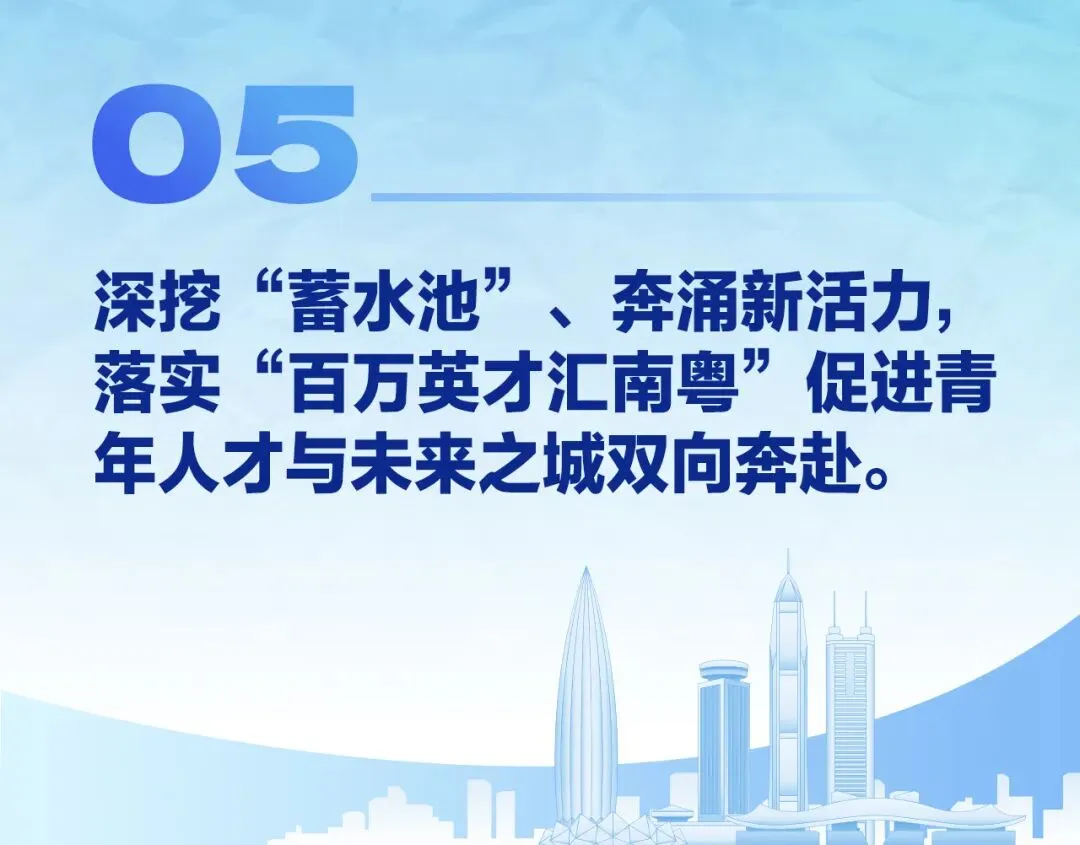 发挥深圳“主力军”作用,会同人社部门落实“百万英才汇南粤”行动计划,向全球英才发出逐梦邀约,赴北京、上海等地举办16场N城联动招聘活动。成功承办秋季大型综合招聘会,现场1825家重点单位参加,提供超6.5万个优质岗位,两天进场近15万人,招聘单位数、单位岗位数、入场学生数均创历史新高,获“史上最强秋招”盛誉。深圳不仅靠无限发展机遇吸引人,也提供高效贴心服务成就人,出台《关于加强青年人才来深发展服务保障的若干措施》及系列配套办法,为来深青年人才提供“一张床、一间房、一套房”无忧安居服务和“一张办公桌、一间办公室、一层办公楼”乐业办公保障。举办人才嘉年华等“人才日”系列活动,《来了就是深圳人才》创意宣传片全网传播过1亿次。深圳连续第3年位居《中国城市95后人才吸引力排名》首位,2025年获评“最佳引才城市”,全市人才总量达719万、“十四五”时期增加80万,展现出对人才强大的磁吸效应。