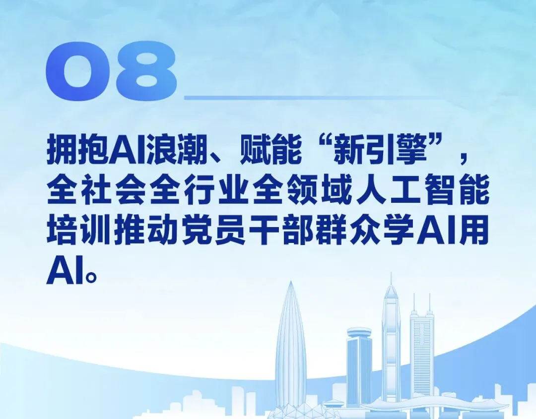 面对新一代人工智能技术快速演进的新趋势,组织开展人工智能通识培训、场景应用专题培训,线下线上培训干部超140万人次。实施人工智能培训课程“十百千”计划,举办6期AI大讲堂,邀请“科学家+企业家”的科创新锐“进党校、上讲台”,促进政企对接、服务企业创新发展。坚持投资于人、赋能于城,依托遍布全市的党群服务中心,市区街社联动打造党员群众“家门口”的AI夜校、“小小科学家”训练营,构建人人可学、处处能学、学以致用的学习生态,服务群众超100万人次。