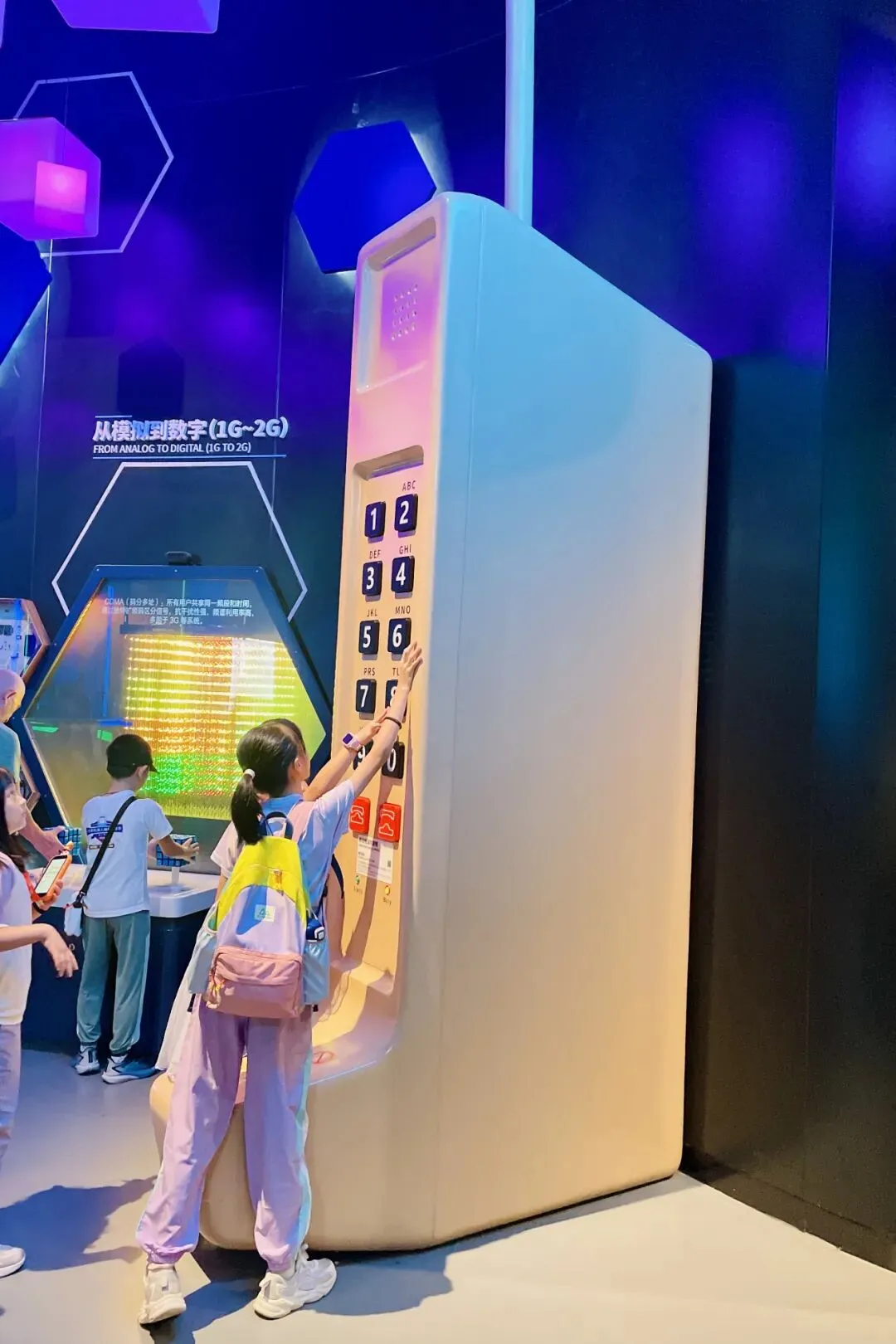 在通信科技专馆,孩子能亲手体验各类通信小实验。拨动数字按钮,观察灯光流动模拟数据传输,秒懂计算机0和1的二进制逻辑。