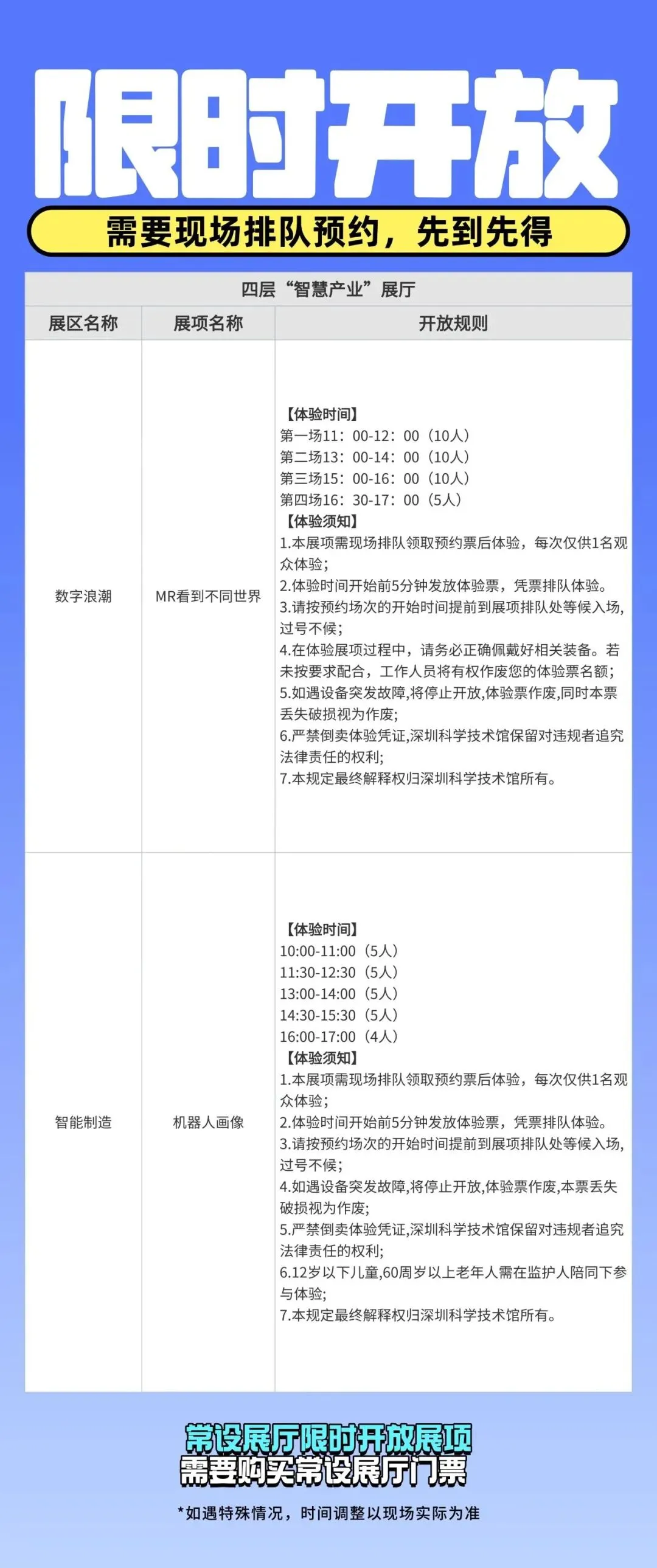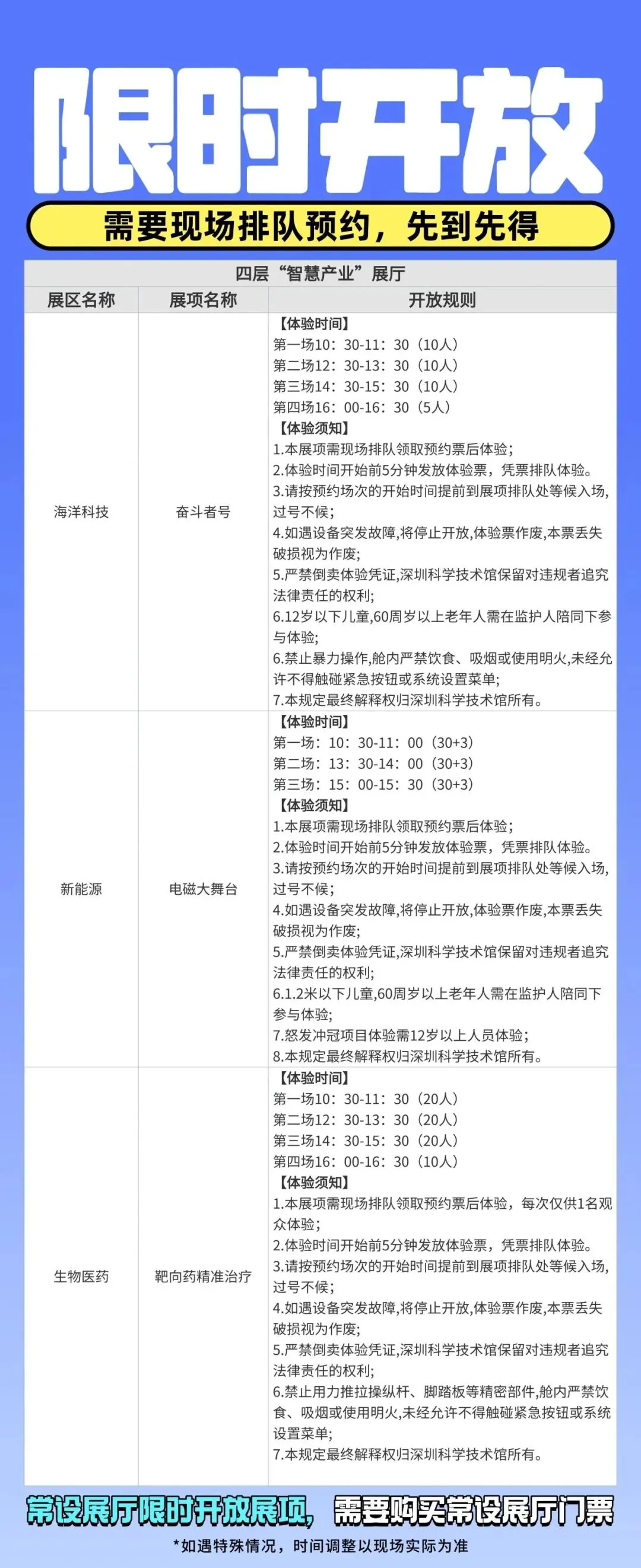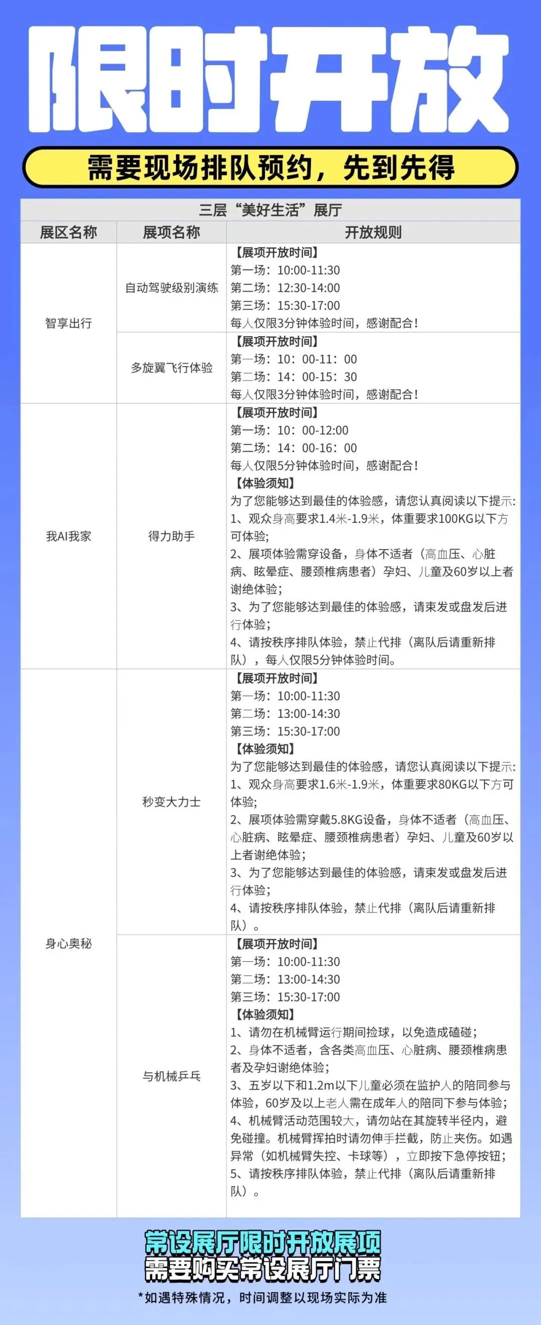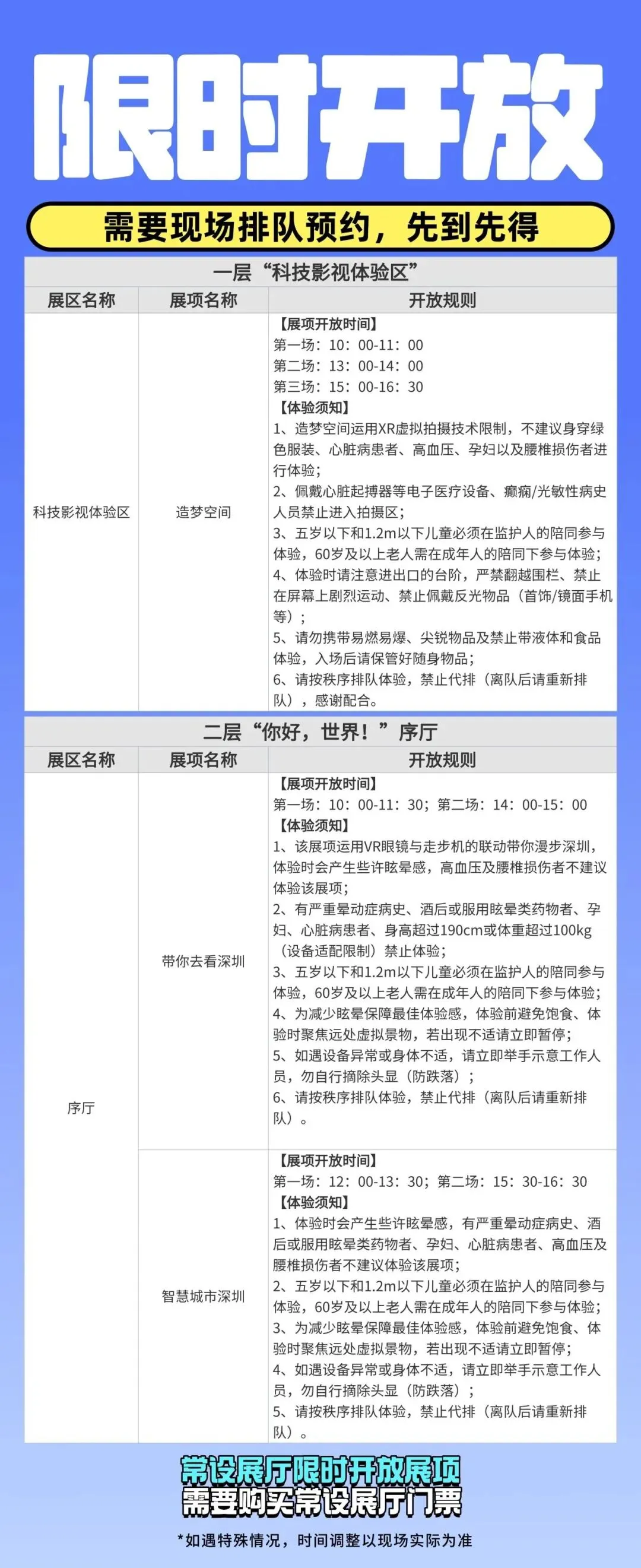 6.馆内的许多体验项目定时开放、需要排队且有人数限制,先到先得,感兴趣的项目最好提前去排队。