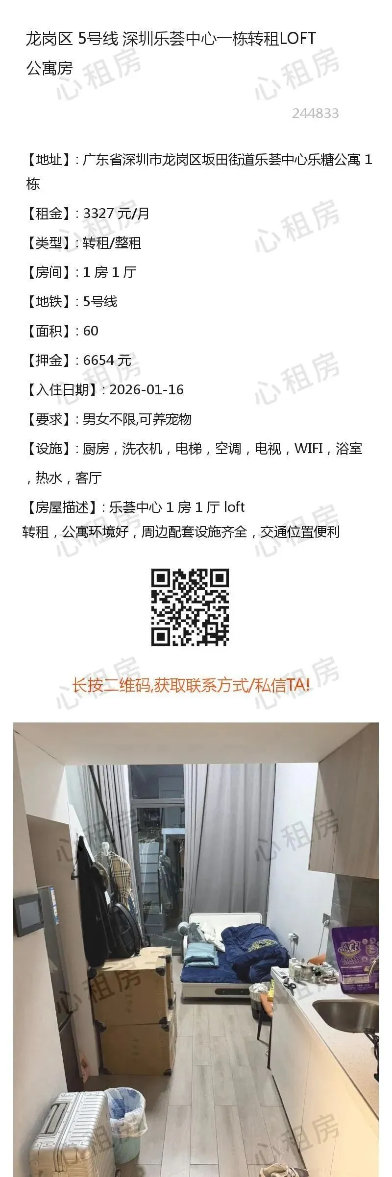 深圳房>>龙岗区5号线深圳乐荟中心一栋转租LOFT公寓房3327元/月
