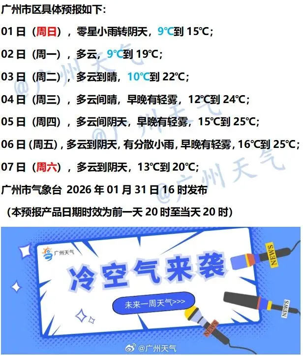 据@广州天气 预测:受冷空气补充影响,广州市零星小雨转多云,今明两天(1日和2日)早晨出现过程最低气温9℃,陆地阵风加大至4~6级,港区和高地阵风6~8级。